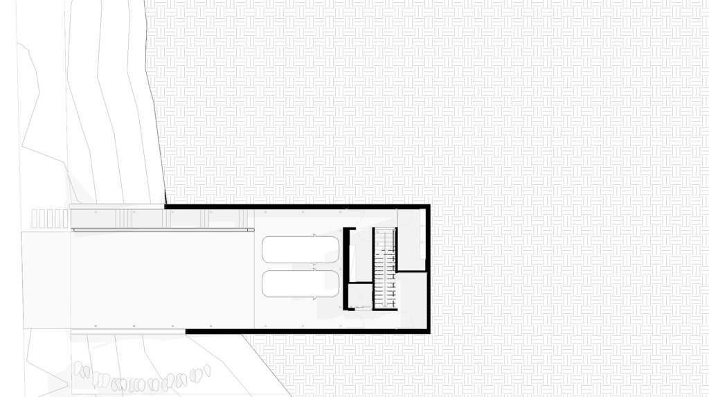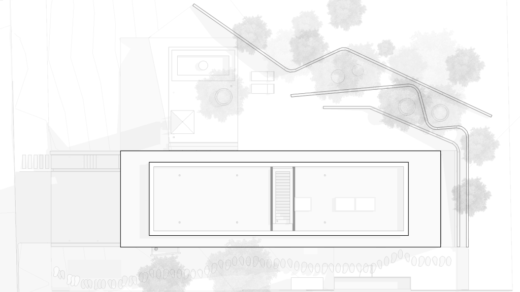 Situada en un terreno con una topografía peculiar, el concepto del proyecto parte de la colocación de un volumen puro de hormigón visto en la parte superior del terreno, lo que permite vistas despejadas del entorno y privacidad desde la calle principal.