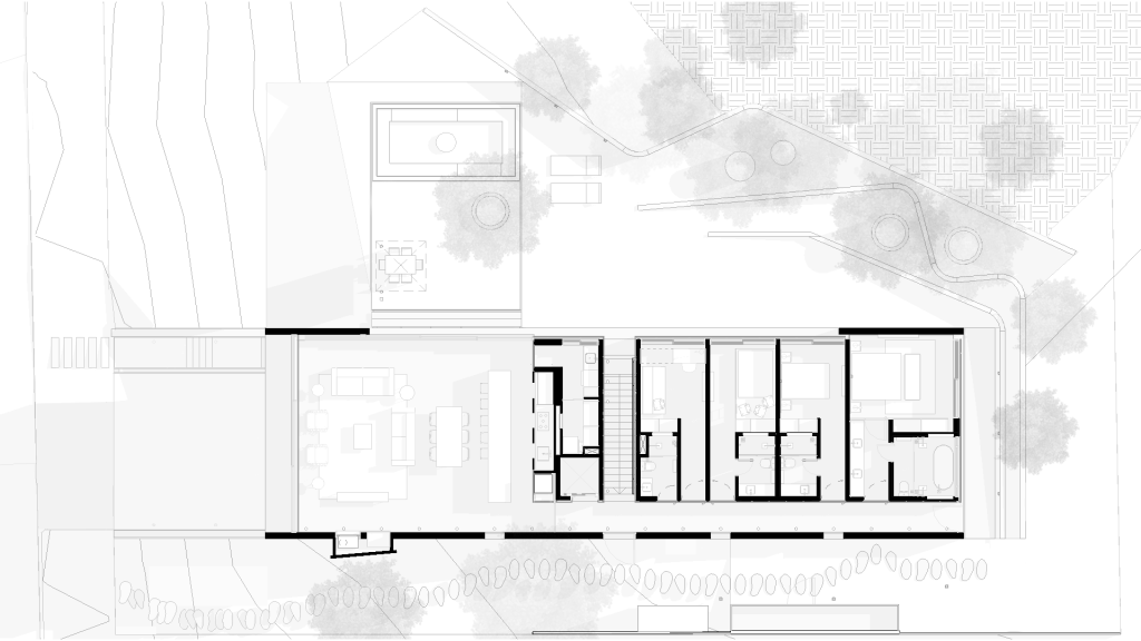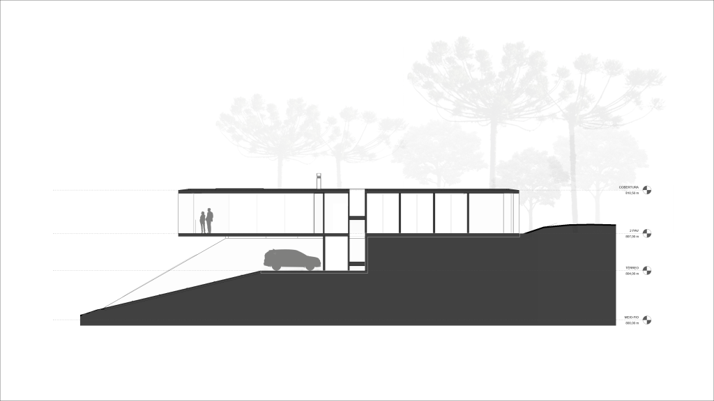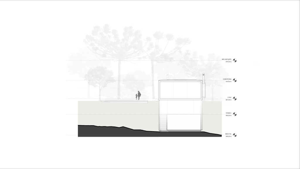 A partir de esta disposición vertical, el edificio se alinea con el retranqueo sur, creando una amplia zona de ocio al aire libre orientada al norte, a la sombra de las araucarias existentes. Mientras que la parte delantera de la casa está dedicada a las áreas sociales, las habitaciones se ubican en la parte trasera, todas conectadas directamente con el patio.