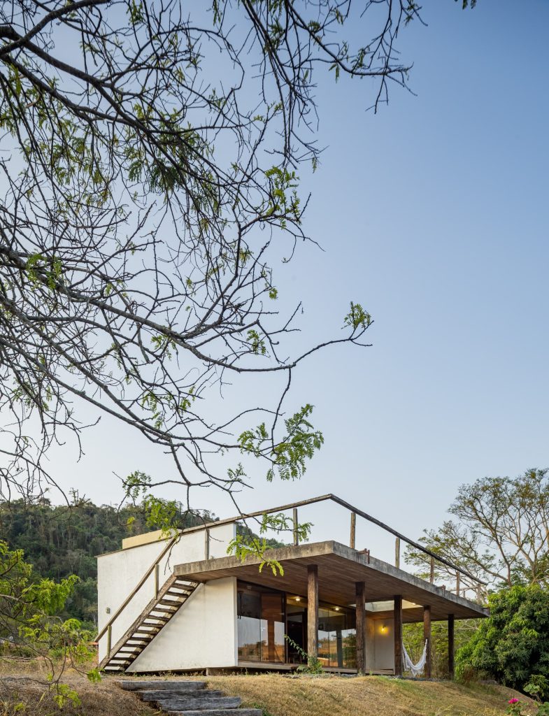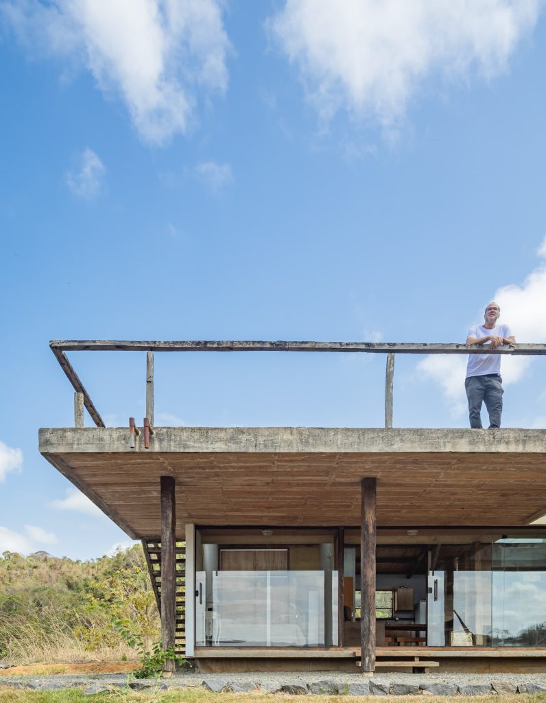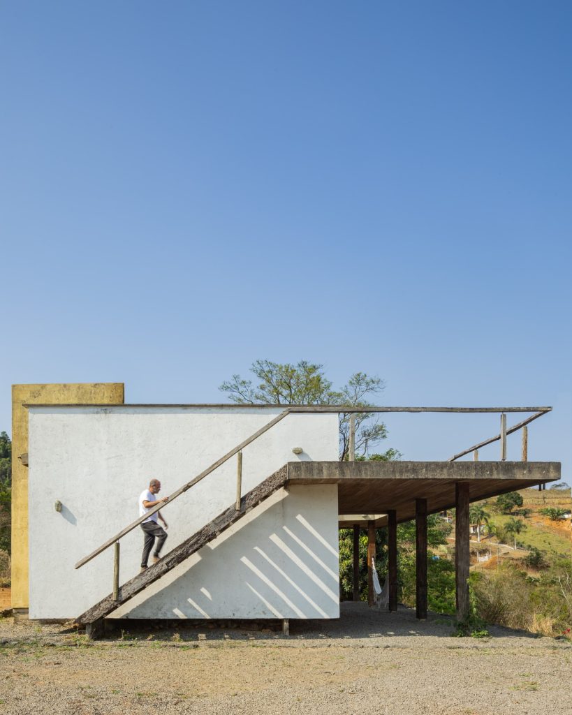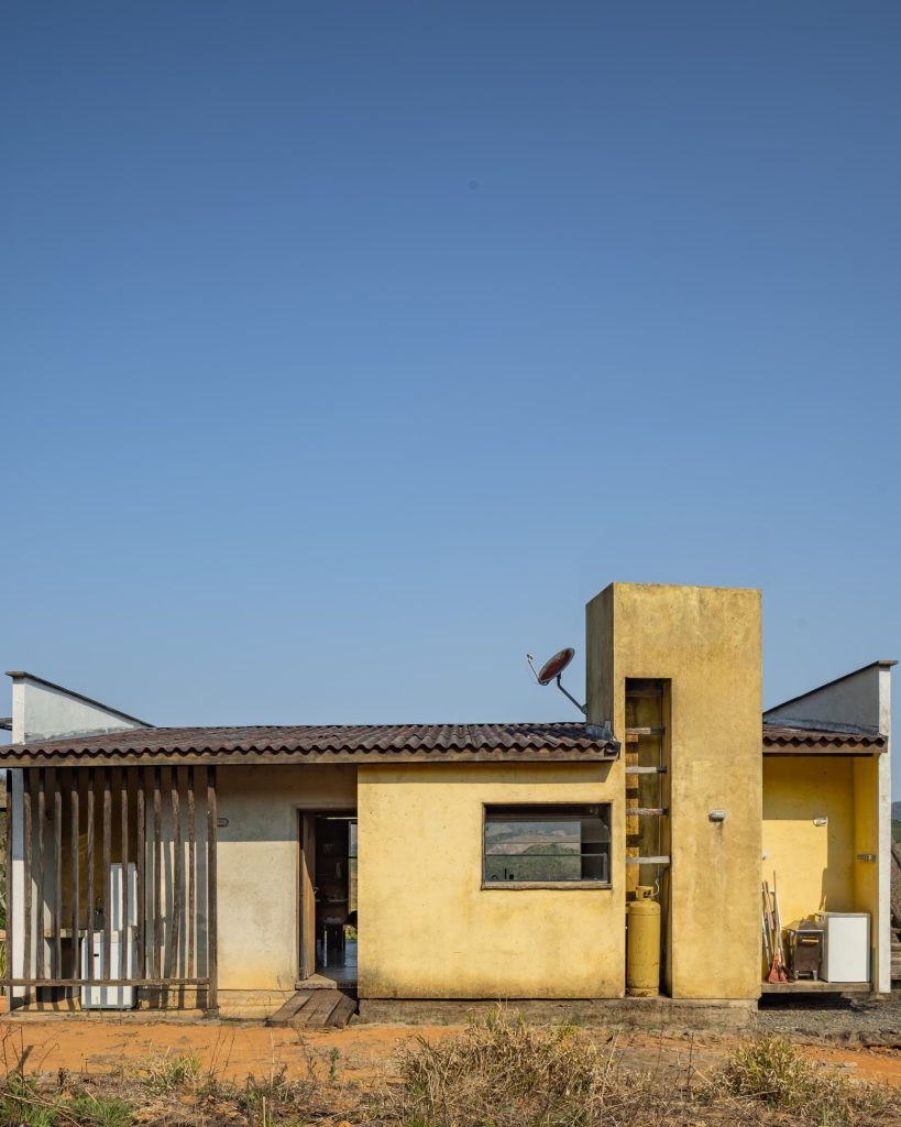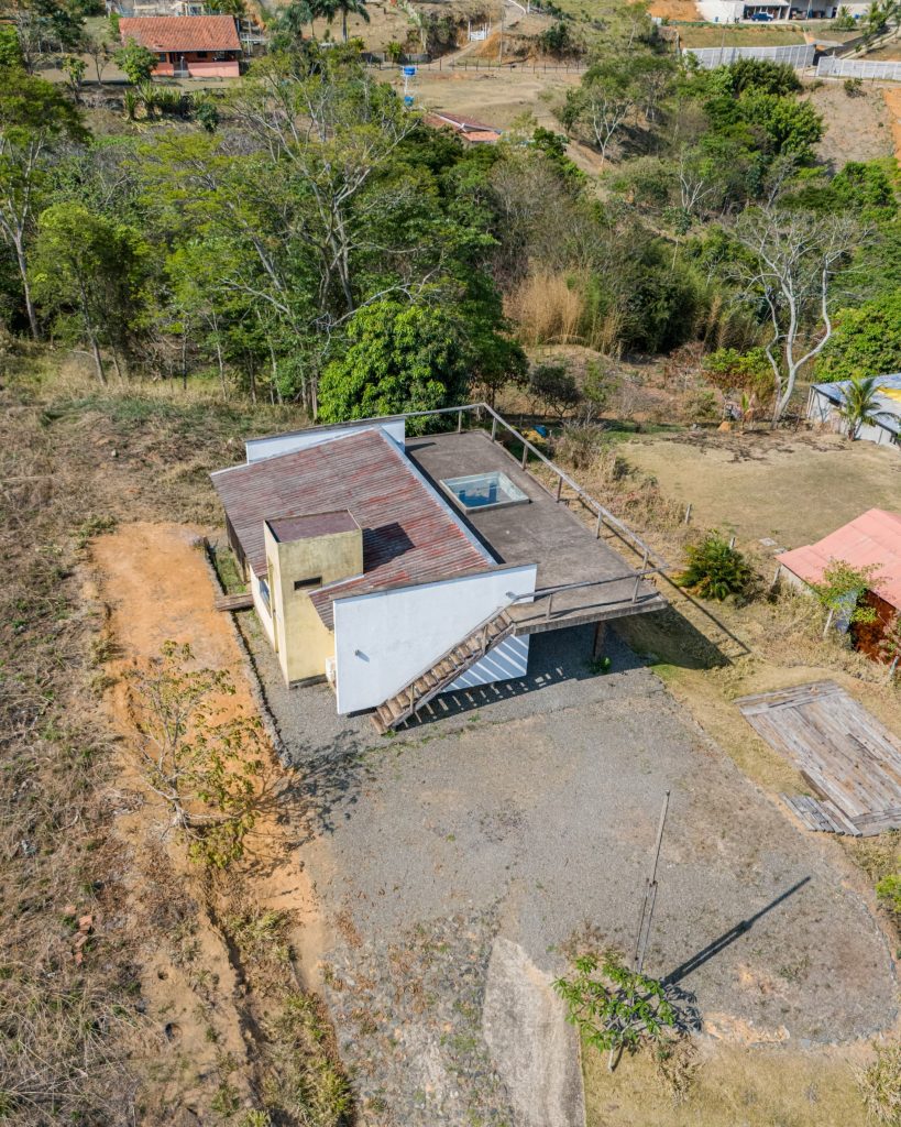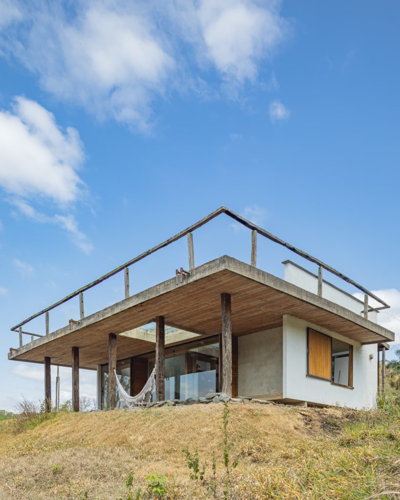 Memoria enviada por el estudio de arquitectura. La casa ocupa la cima de una franja de tierra situada en una colina a 10 km del perímetro urbano de Matias Barbosa, en Minas Gerais. Es un pequeño pabellón de 70m² extendido con otros 70m² de terraza y porche. Su losa de piso está elevada 40 cm del suelo mediante cimientos expuestos, lo que, junto con la elevación de sus paredes laterales, permite un cerramiento de piedras secas para la ventilación del recinto. Las estructuras de madera fueron realizadas con durmientes ferroviarios reutilizados, permitiendo el montaje con mano de obra local.