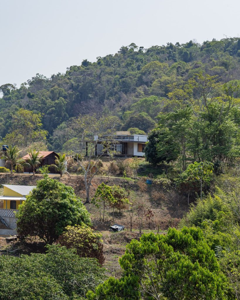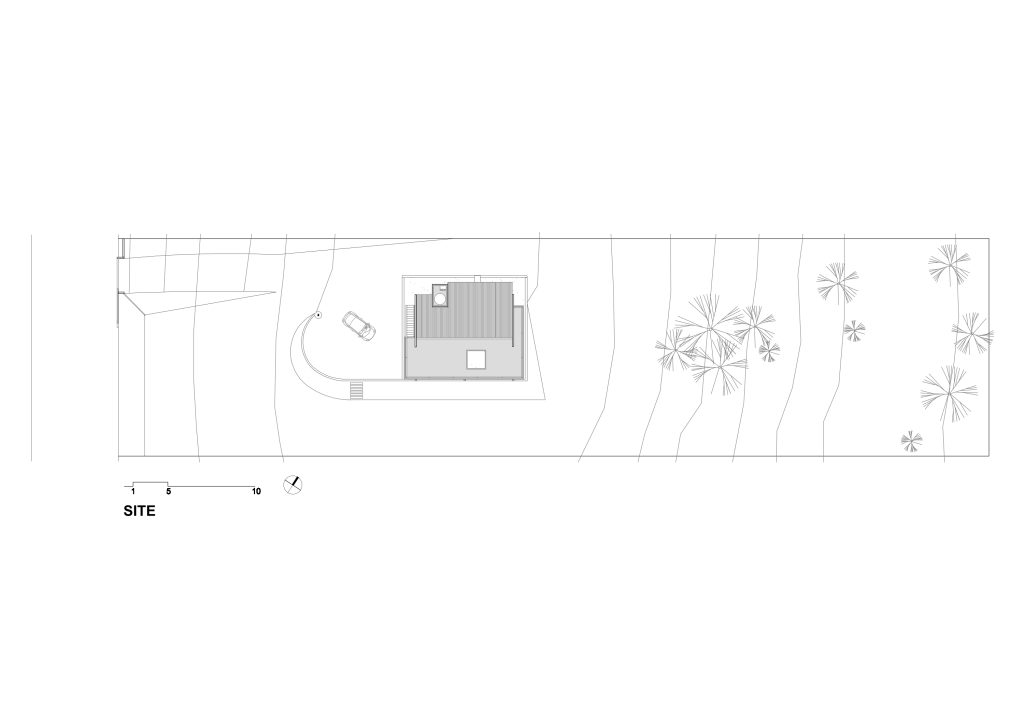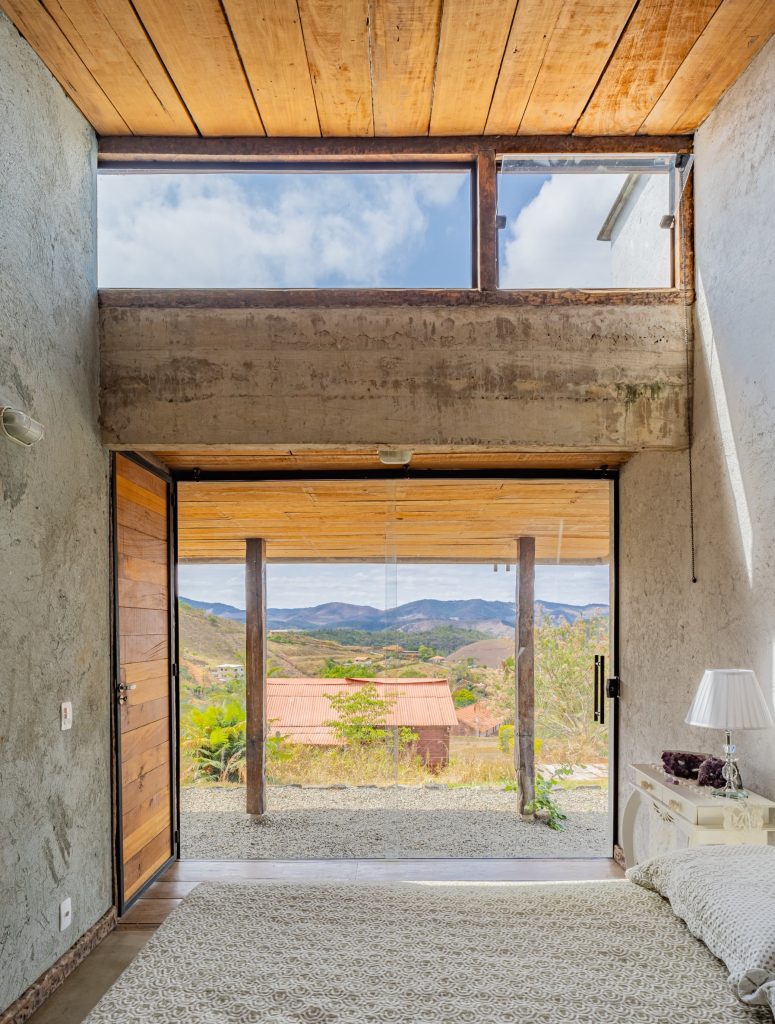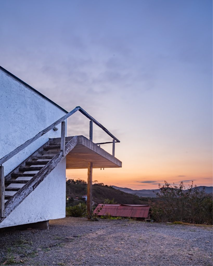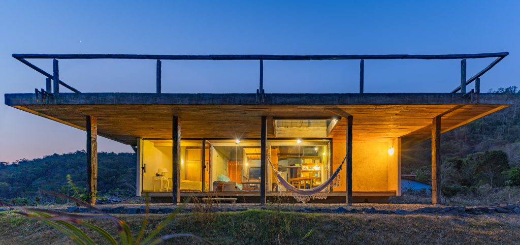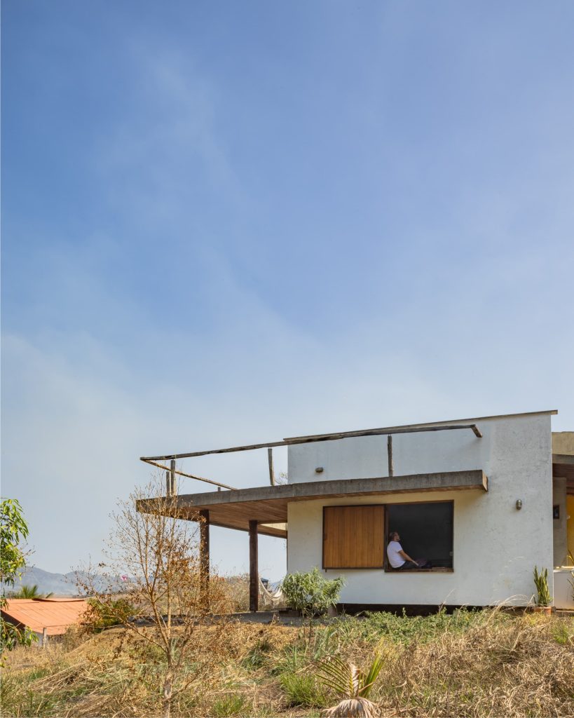 Memoria enviada por el estudio de arquitectura. La casa ocupa la cima de una franja de tierra situada en una colina a 10 km del perímetro urbano de Matias Barbosa, en Minas Gerais. Es un pequeño pabellón de 70m² extendido con otros 70m² de terraza y porche. Su losa de piso está elevada 40 cm del suelo mediante cimientos expuestos, lo que, junto con la elevación de sus paredes laterales, permite un cerramiento de piedras secas para la ventilación del recinto. Las estructuras de madera fueron realizadas con durmientes ferroviarios reutilizados, permitiendo el montaje con mano de obra local.