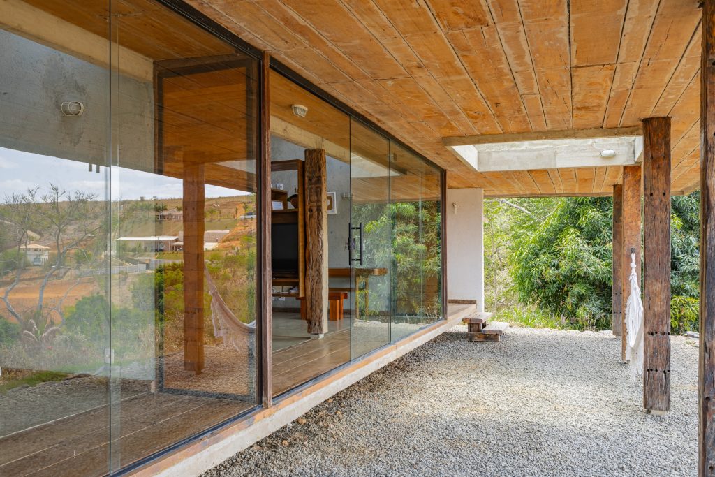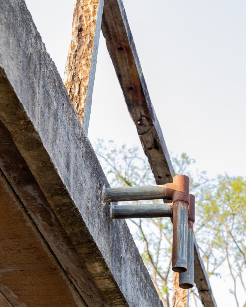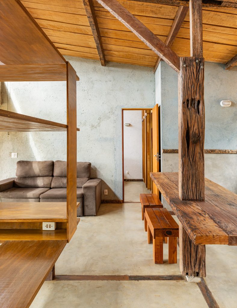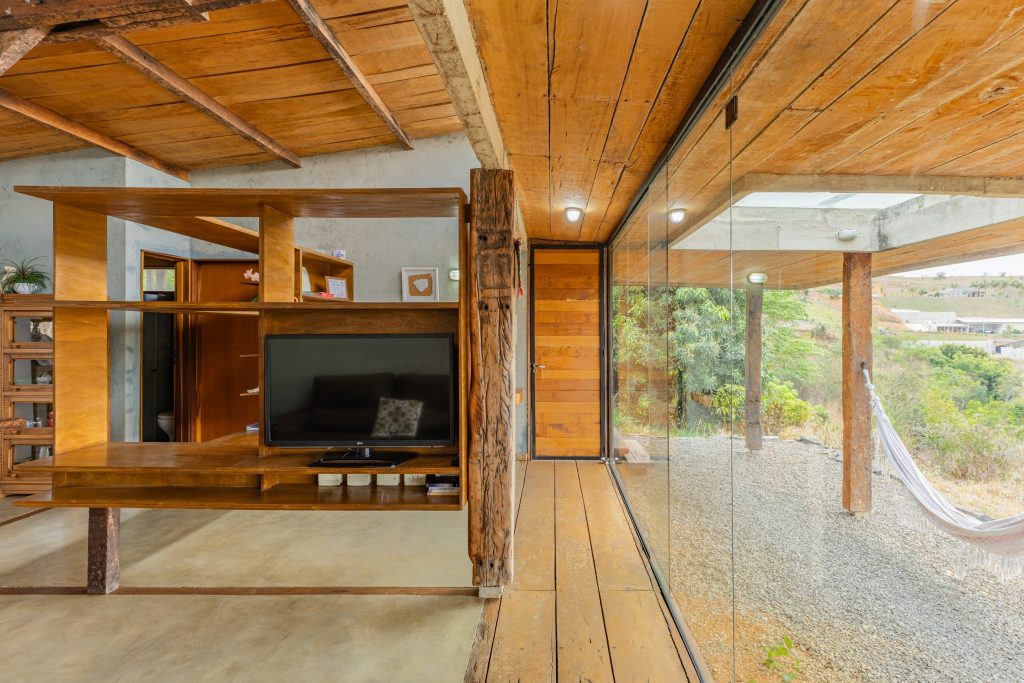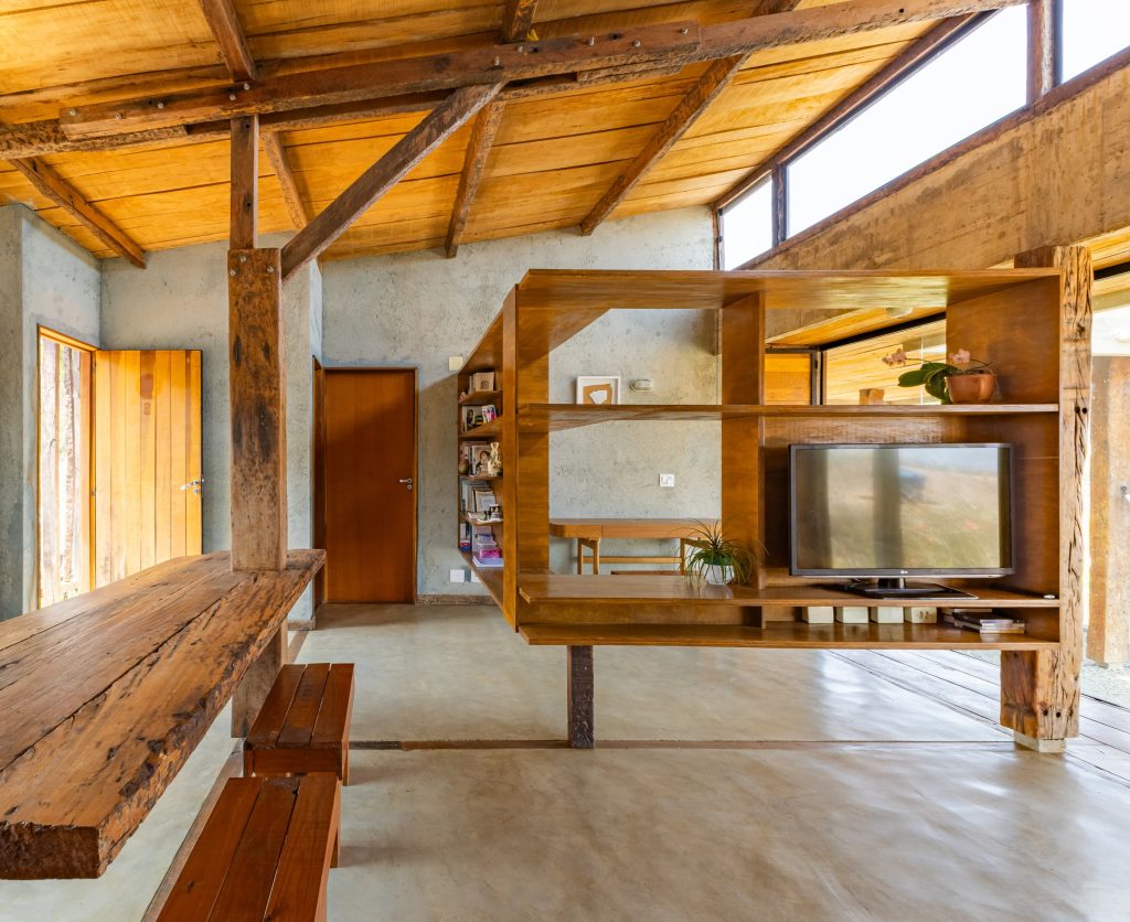 Sobre tablones de jequitibá se construyeron dos techos distintos: uno para la casa y otro para generar su doble extensión: porche y terraza, espacios intermedios entre la casa y la inmensidad. Para estructurar el entablado del techo de fibrocemento, se colocaron cabrios espaciados a 1,20 m, apoyados directamente en las paredes y en la viga compuesta central.