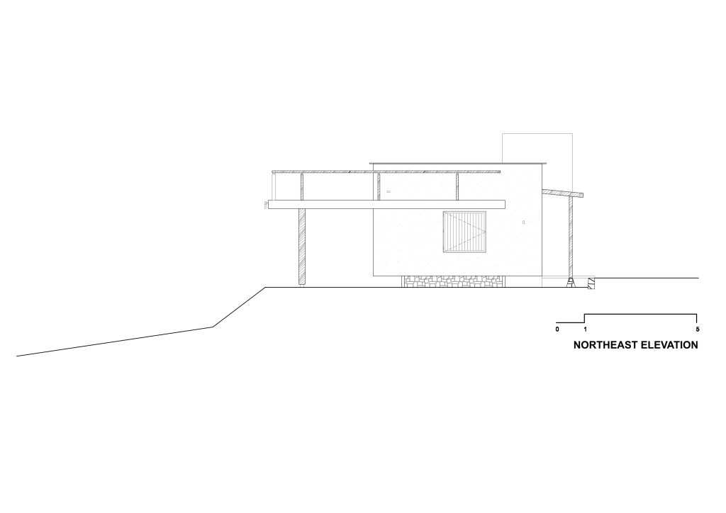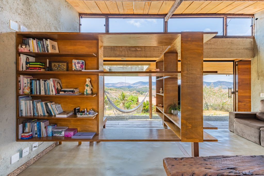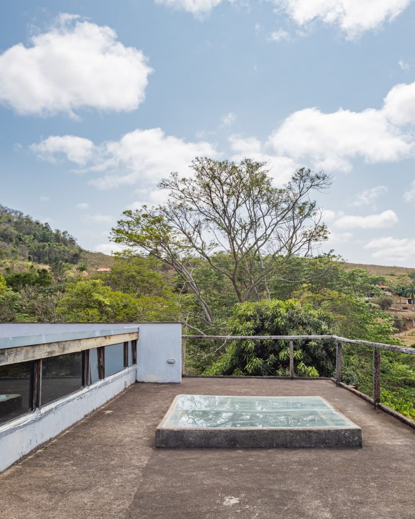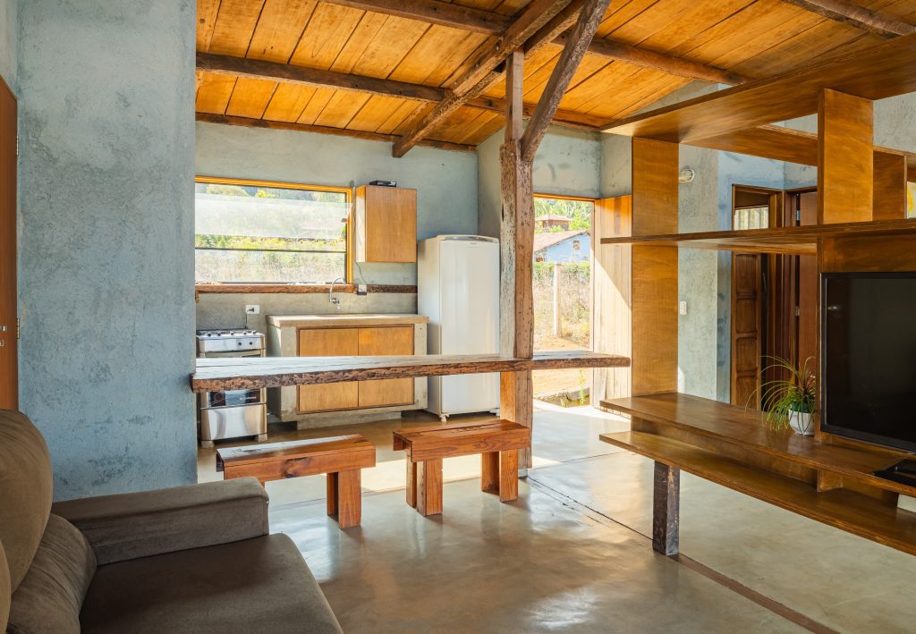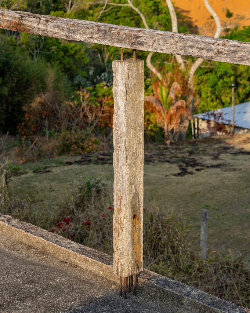 Sobre tablones de jequitibá se construyeron dos techos distintos: uno para la casa y otro para generar su doble extensión: porche y terraza, espacios intermedios entre la casa y la inmensidad. Para estructurar el entablado del techo de fibrocemento, se colocaron cabrios espaciados a 1,20 m, apoyados directamente en las paredes y en la viga compuesta central.