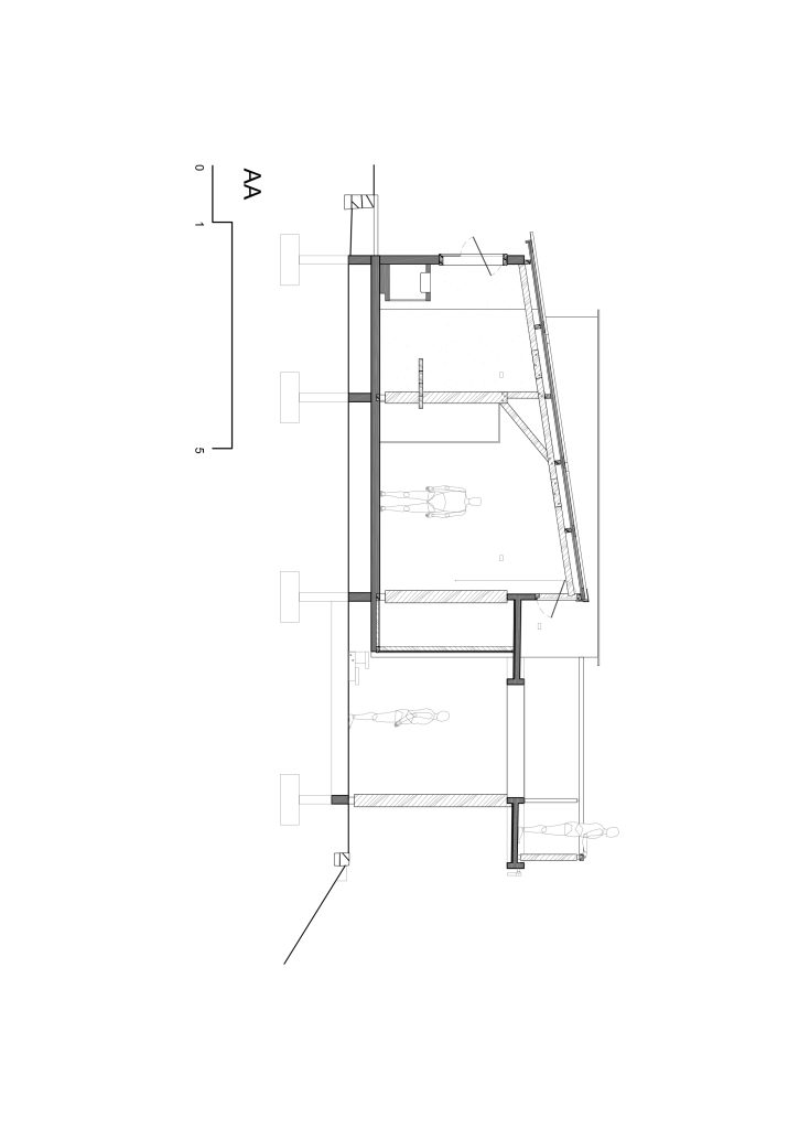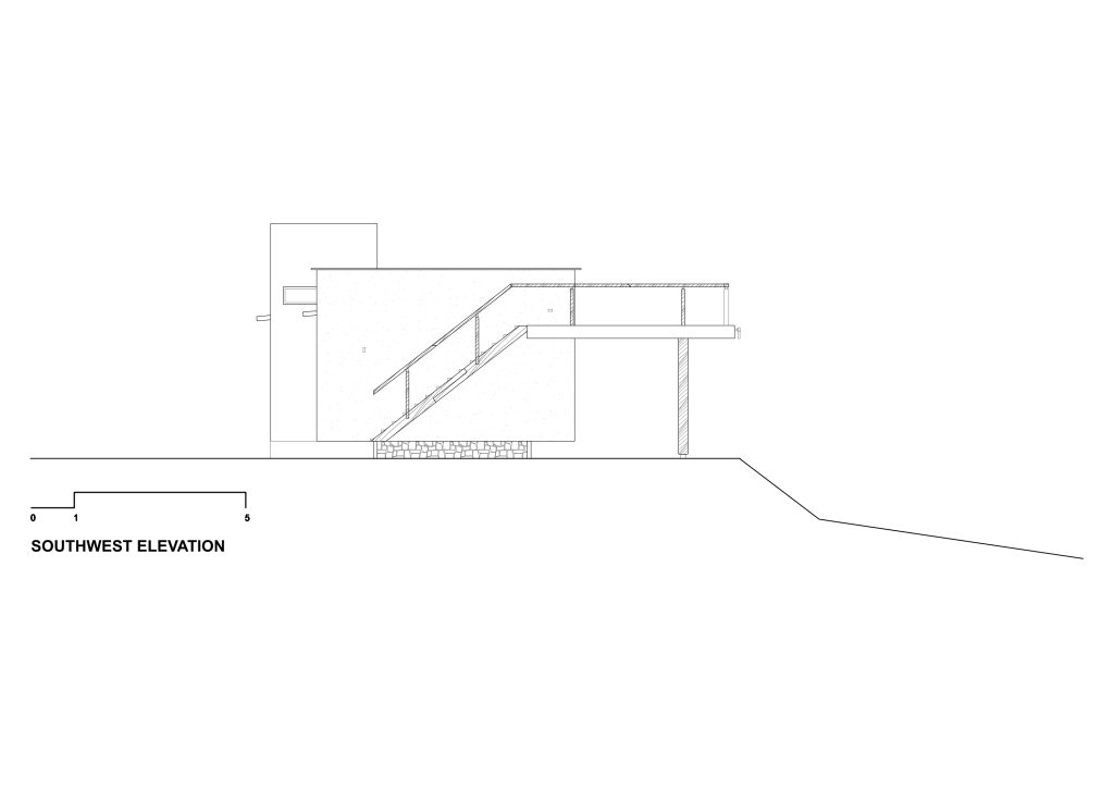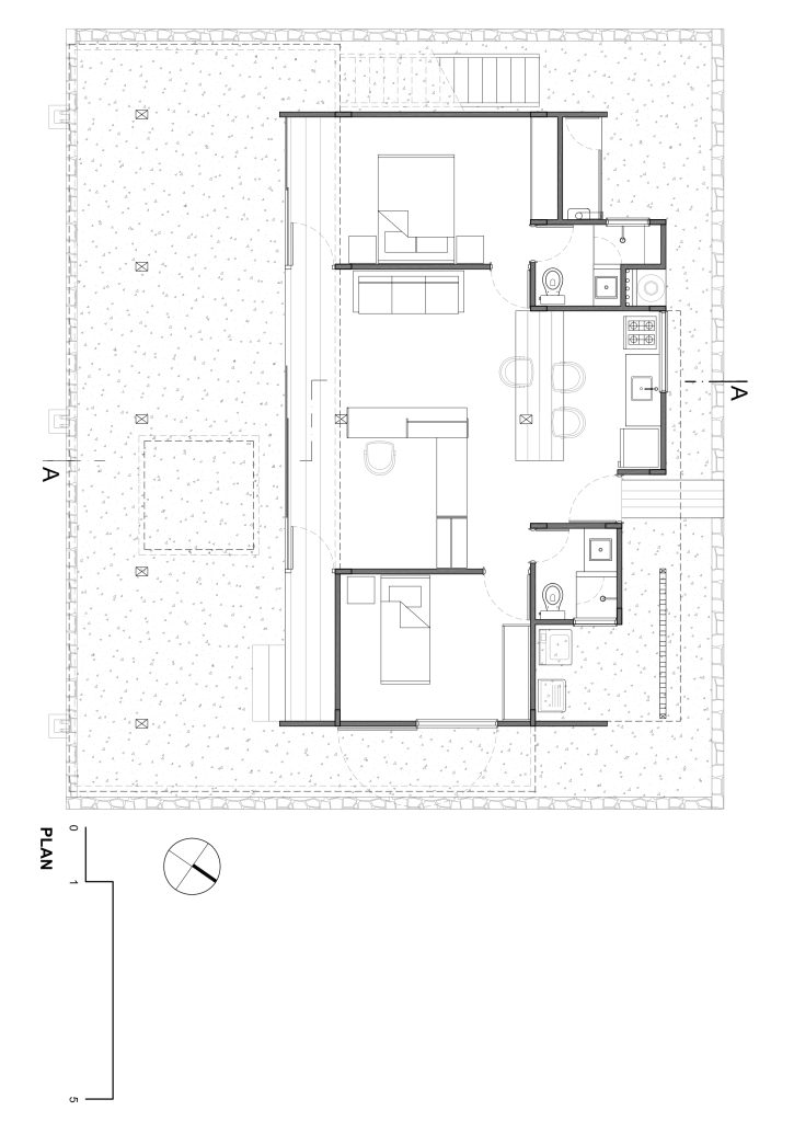 El diseño se organiza a partir de cuatro módulos de 2,80 m, una medida determinada por la longitud del durmiente. De este modo, los pequeños espacios de servicio se agrupan como una barrera térmica frente al sol del noroeste, protegiendo los espacios servidos. La cara sureste queda liberada para la instalación de 30m² de vidrio frente al sol naciente y al paisaje montañoso.