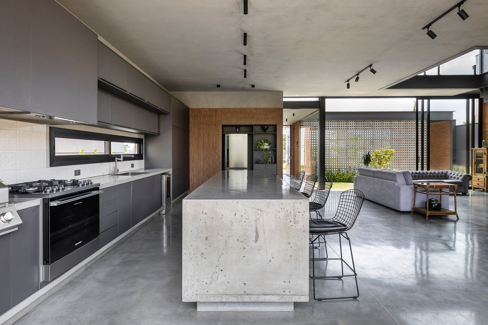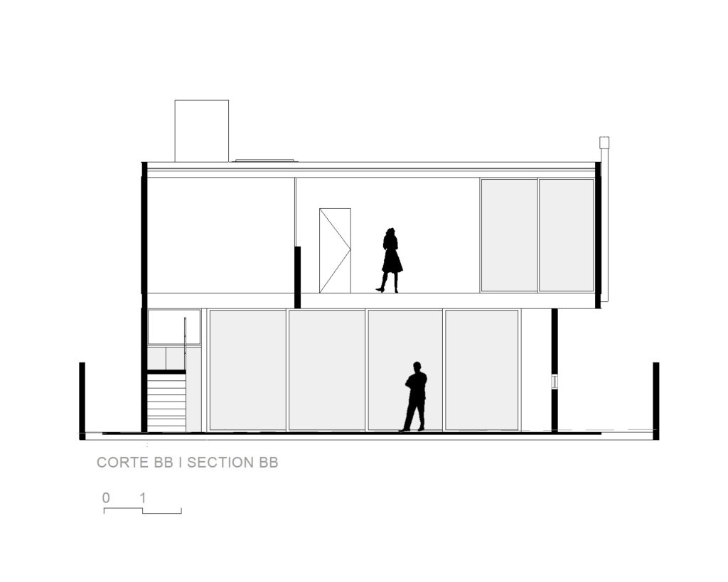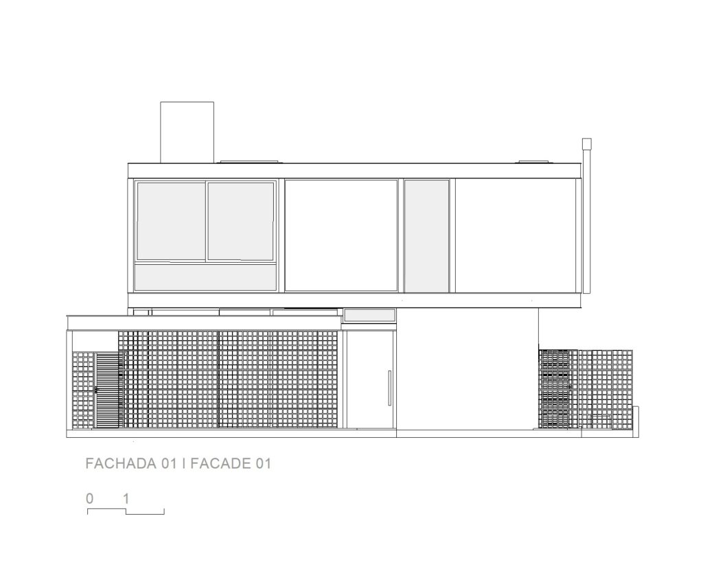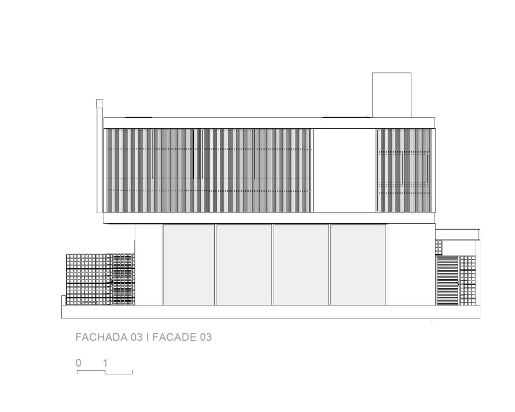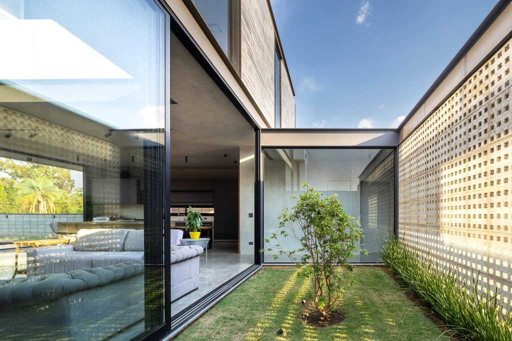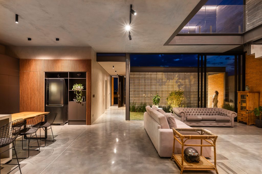 El área social consta de una luz de 7,00 x 10,00 metros, creando un espacio totalmente integrado, con paneles de vidrio en la parte delantera y trasera de este local. El jardín entre el garaje y el área social está cerrado por elementos huecos de concreto que controlan la luz solar desde el lado oeste y brindan privacidad, permitiendo que todo el panel de vidrio permanezca permanentemente abierto.