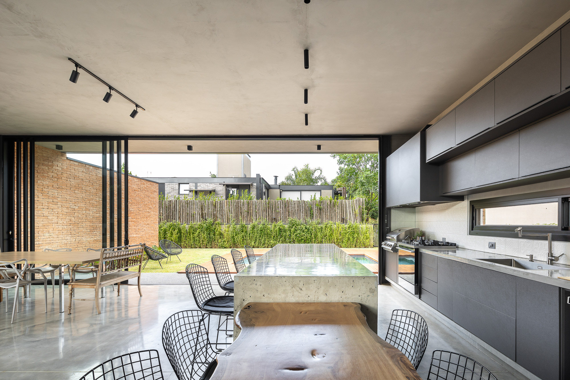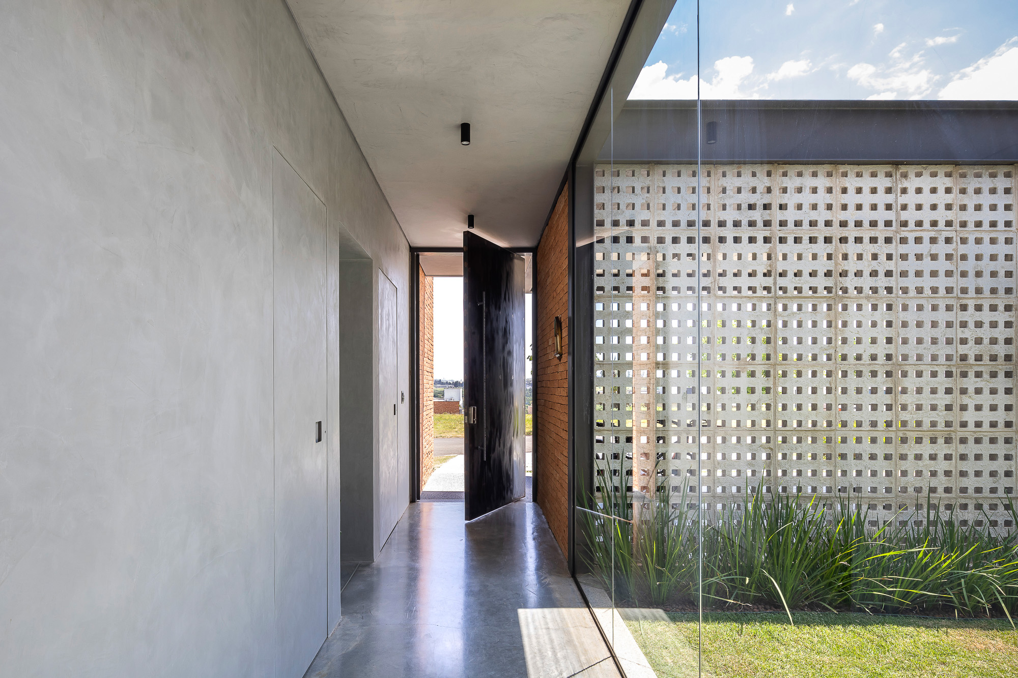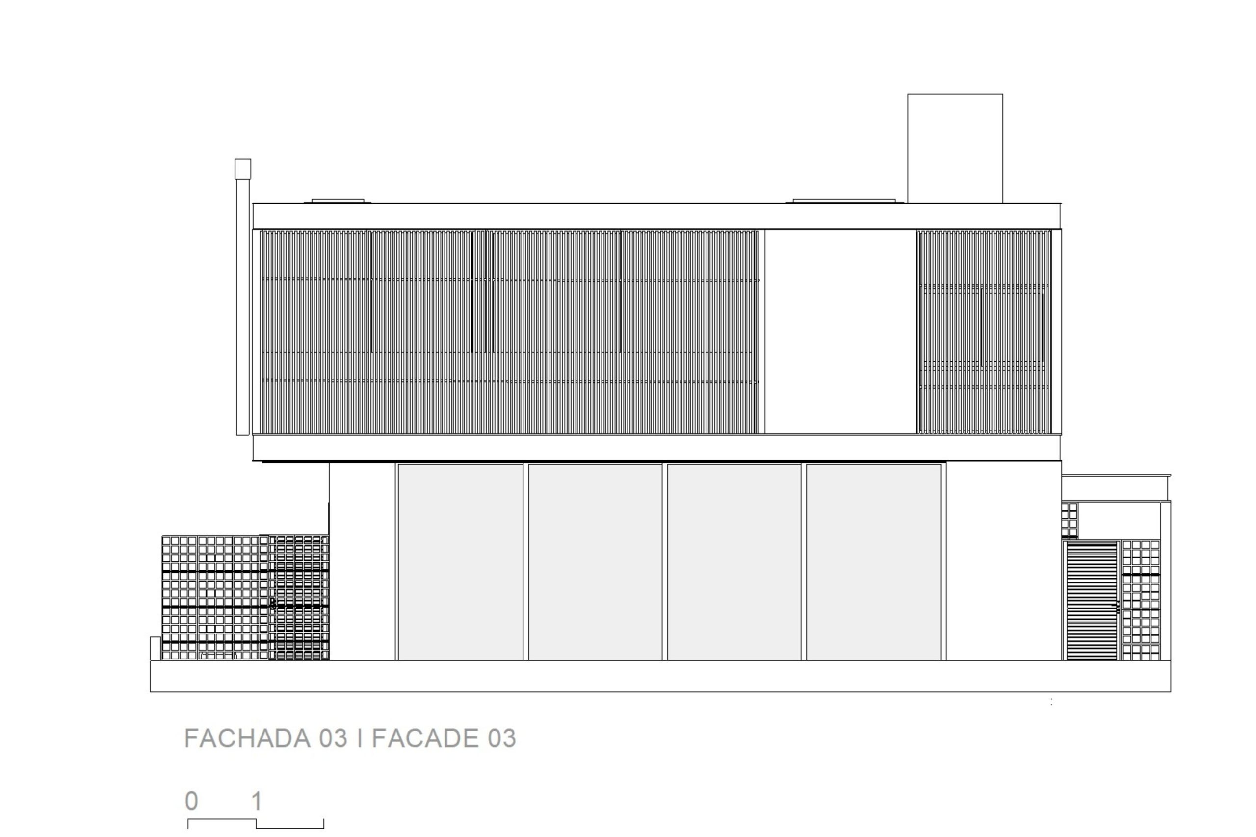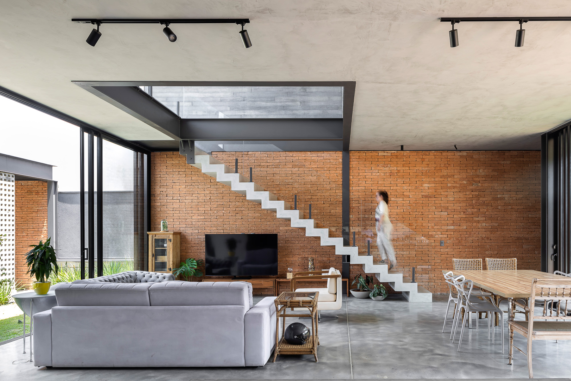 El área social consta de una luz de 7,00 x 10,00 metros, creando un espacio totalmente integrado, con paneles de vidrio en la parte delantera y trasera de este local. El jardín entre el garaje y el área social está cerrado por elementos huecos de concreto que controlan la luz solar desde el lado oeste y brindan privacidad, permitiendo que todo el panel de vidrio permanezca permanentemente abierto.