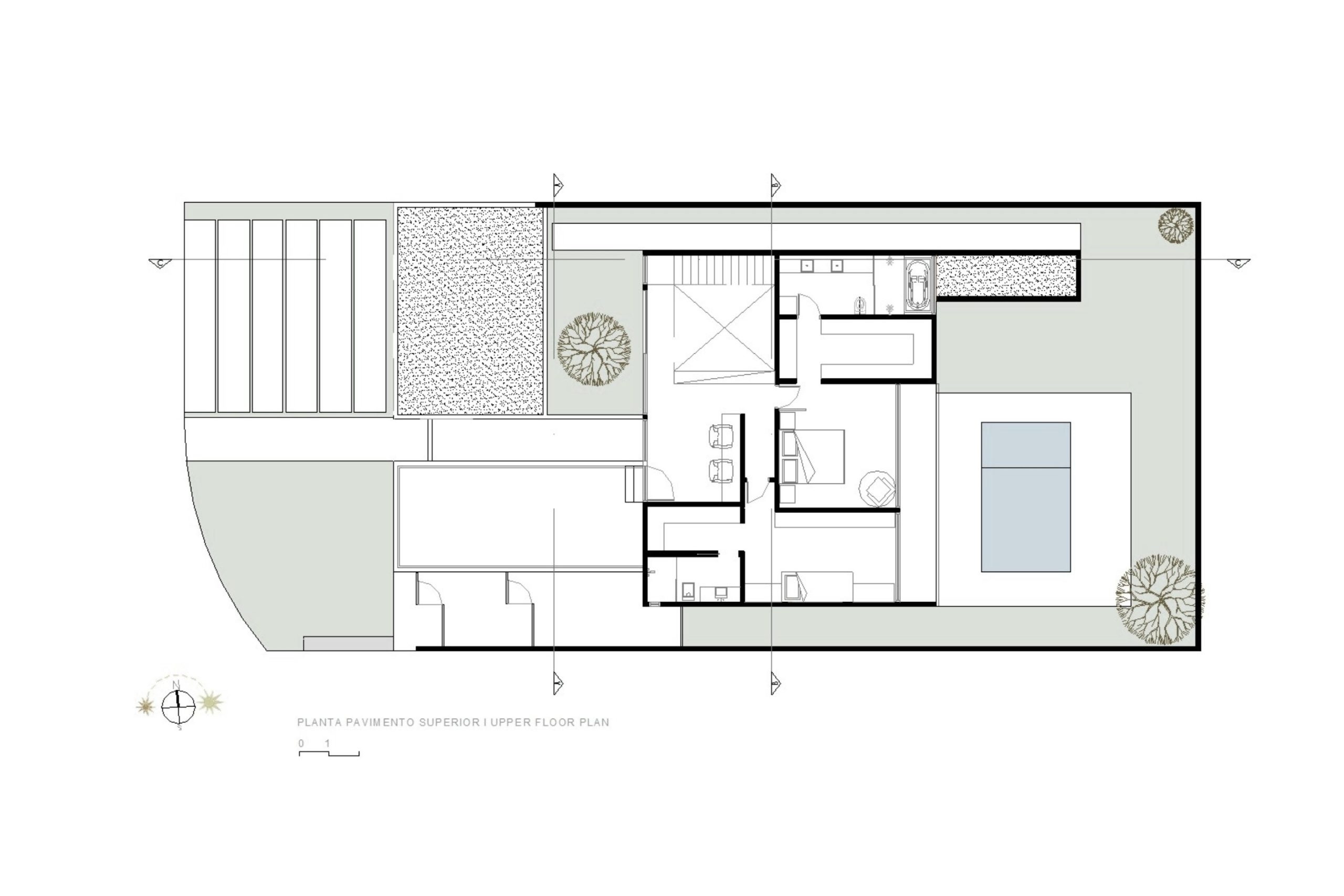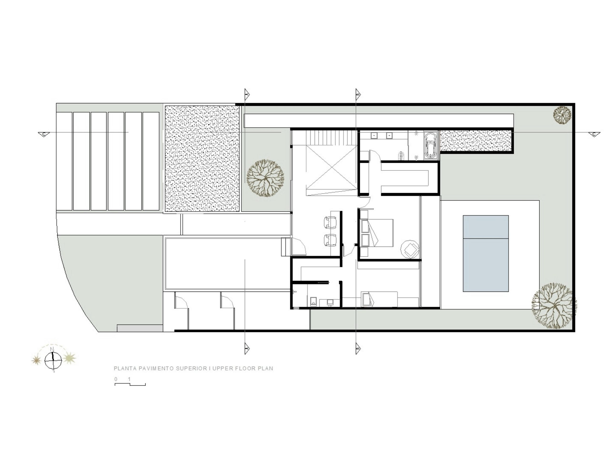 La planta superior alberga dos suites y un despacho, además de permitir el acceso a la terraza que da al atardecer, en la fachada frontal de la residencia. En la fachada posterior se ubican los dormitorios, que tienen vista a una zona verde.
