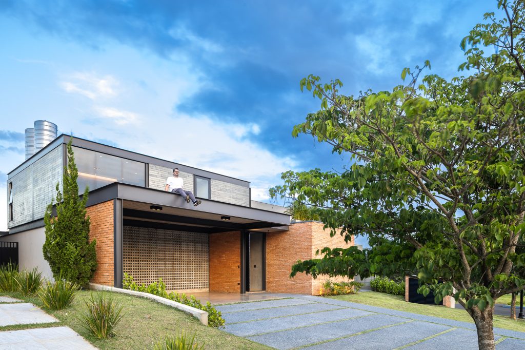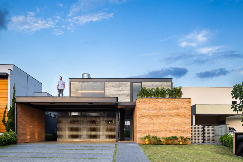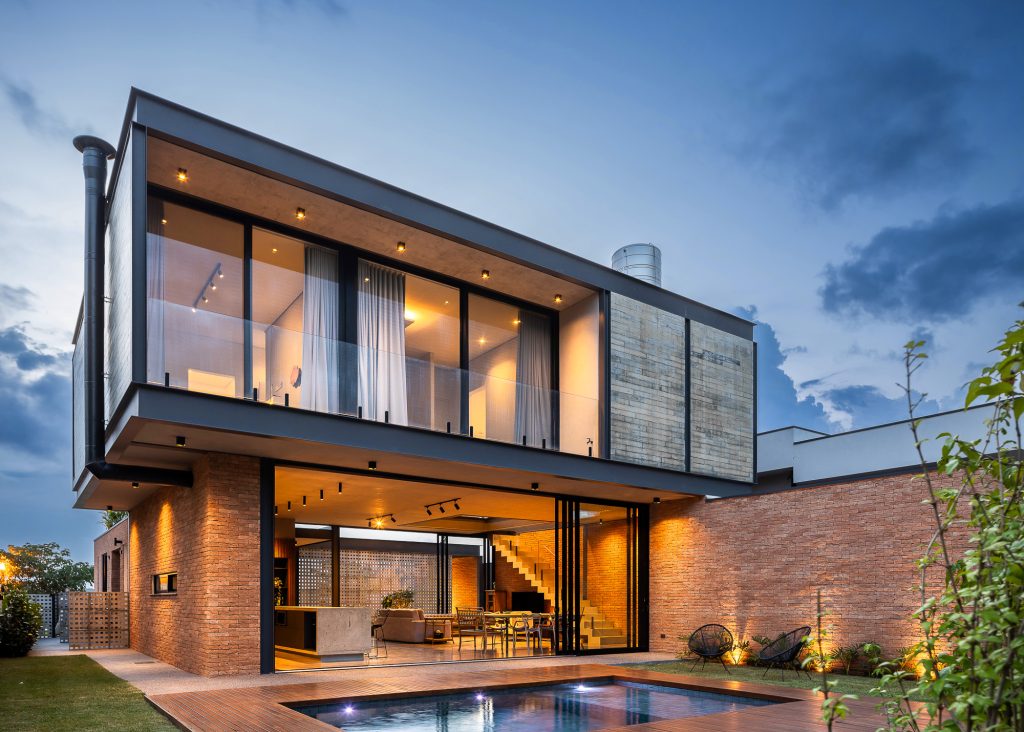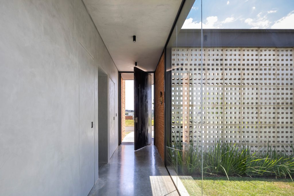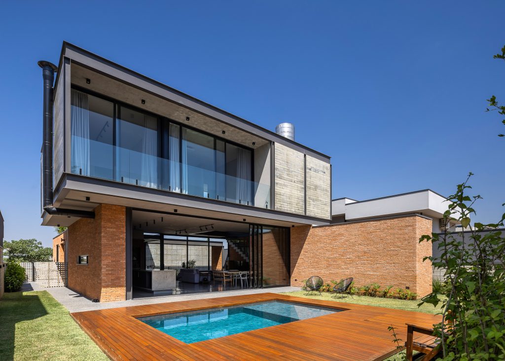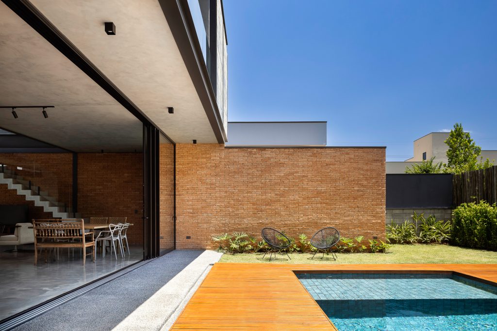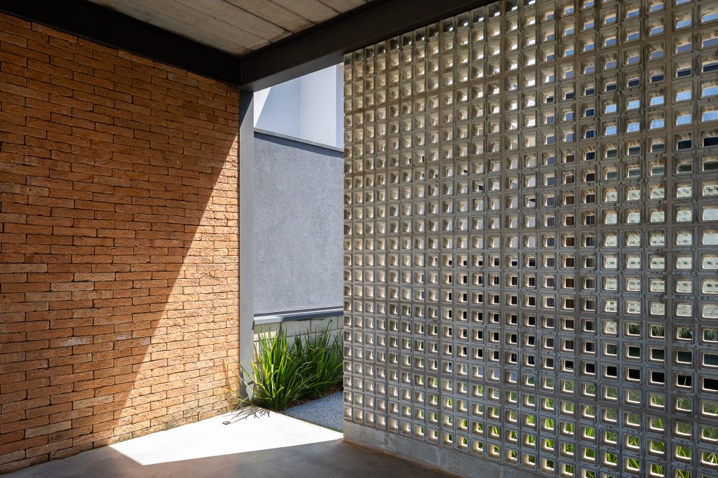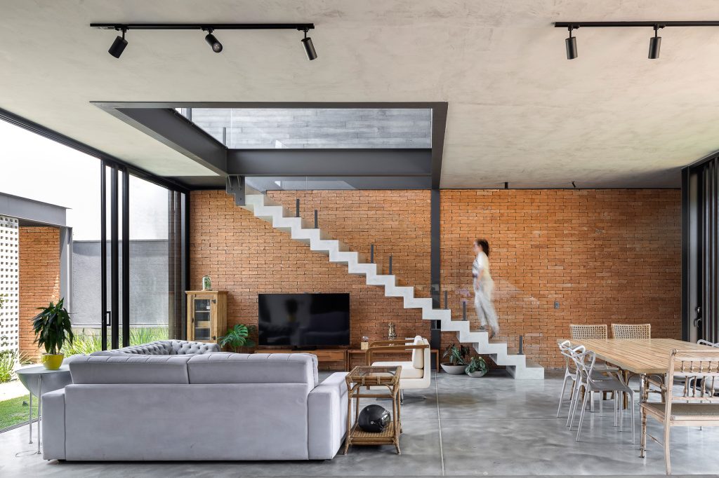 La planta baja es íntegramente de ladrillo visto, mientras que, en la planta superior, el hormigón visto recubre todo el volumen, creando contraste entre las dos plantas, que también incluyen cerramientos de cristal, consiguiendo con esta solución transparencia y permitiendo la entrada de abundante luz natural en todas partes, todas las áreas ambientes del hogar.