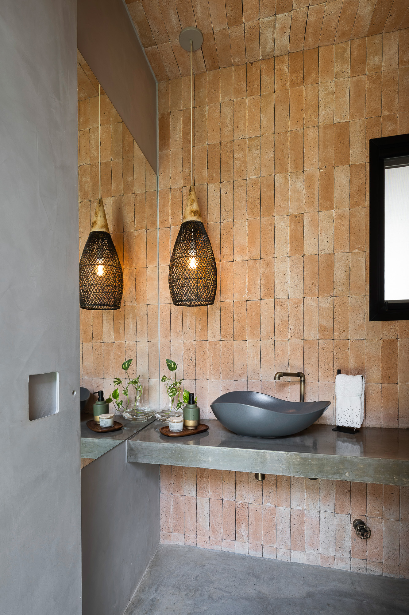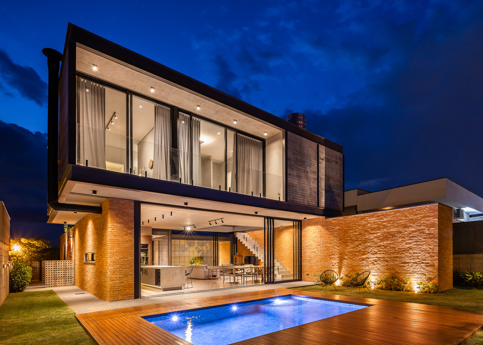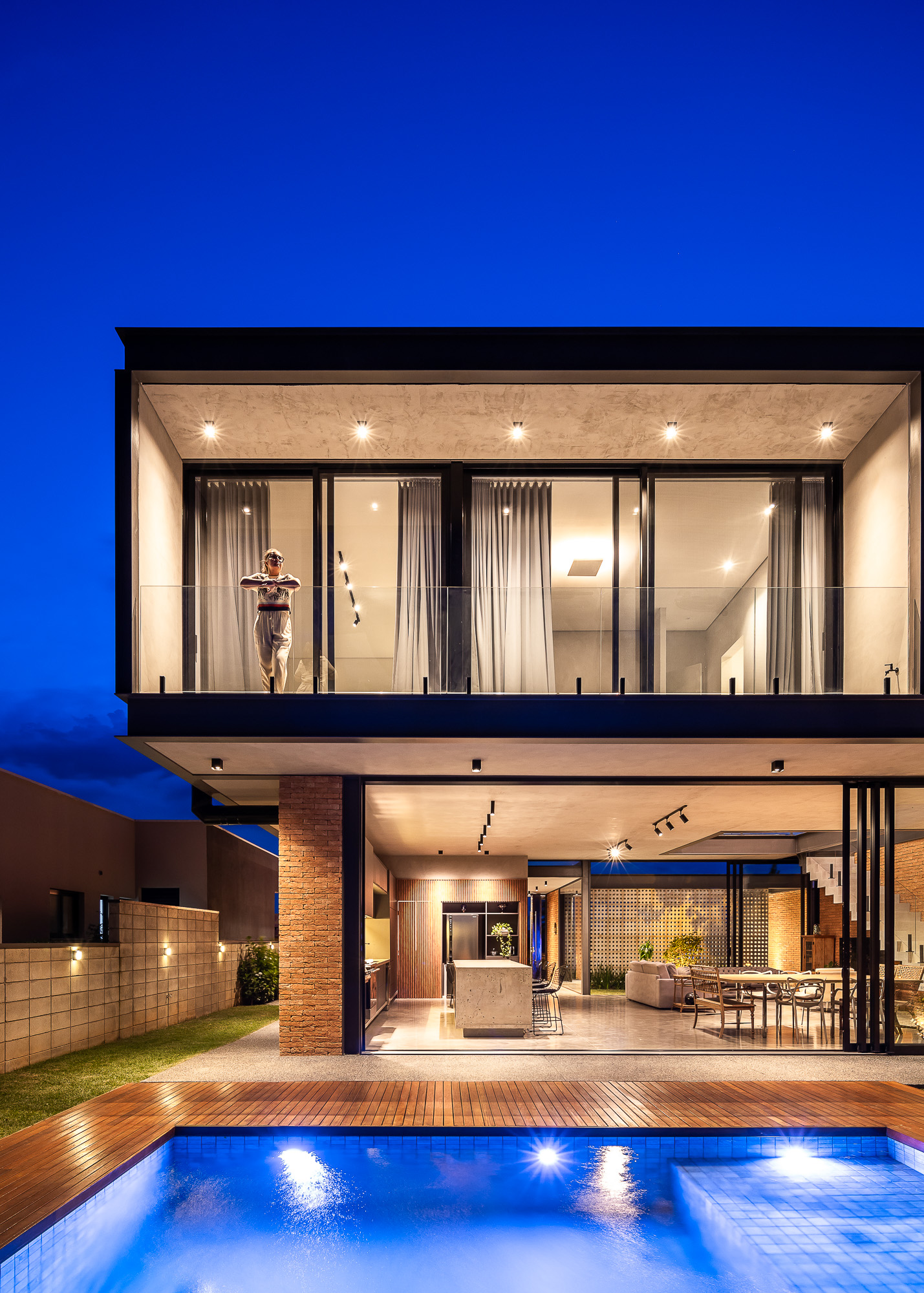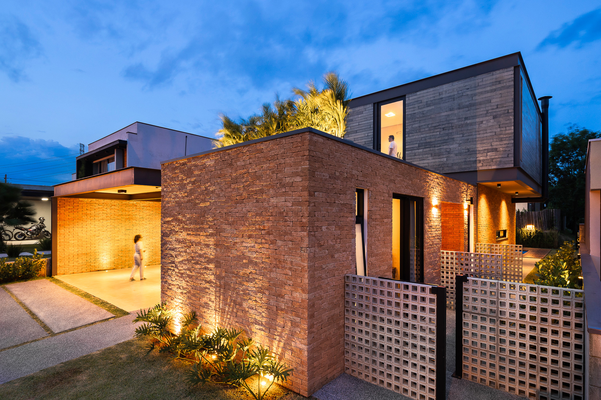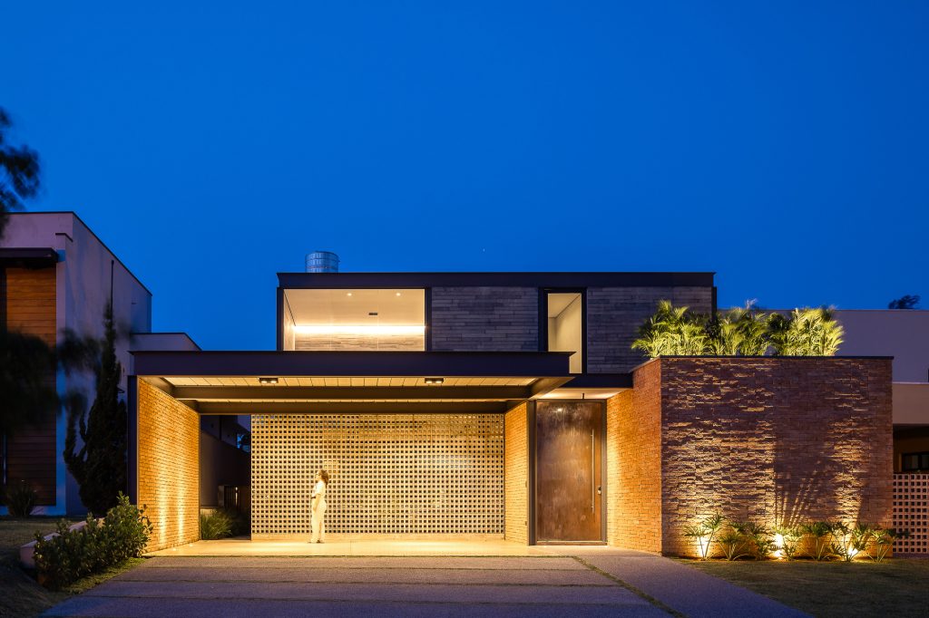 La planta baja es íntegramente de ladrillo visto, mientras que, en la planta superior, el hormigón visto recubre todo el volumen, creando contraste entre las dos plantas, que también incluyen cerramientos de cristal, consiguiendo con esta solución transparencia y permitiendo la entrada de abundante luz natural en todas partes, todas las áreas ambientes del hogar.