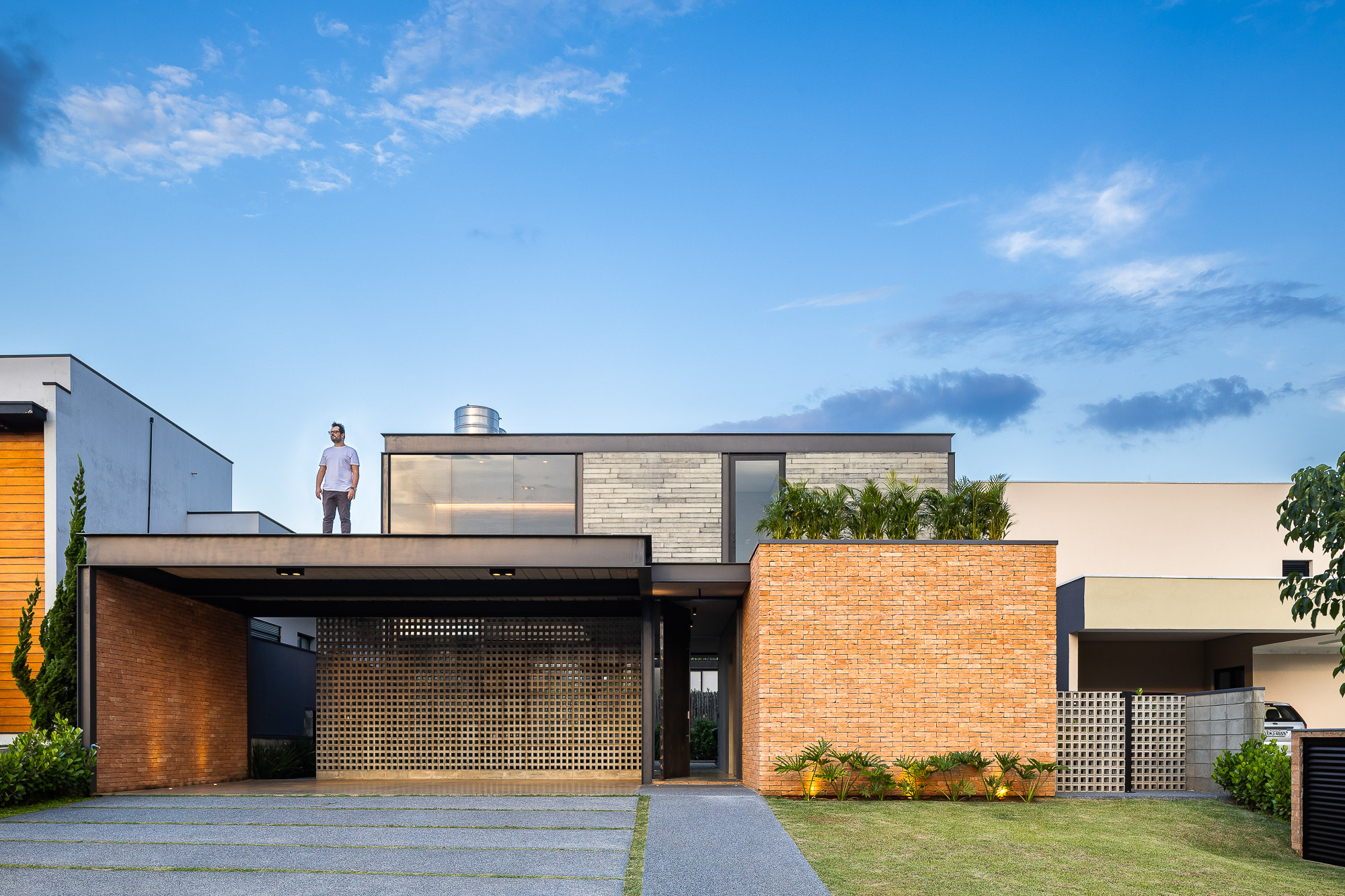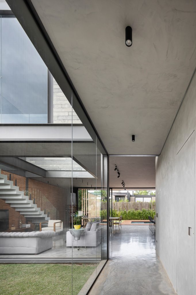 Otro punto que definió el diseño fue una restricción presente en la legislación de condominios, donde el piso superior debe respetar un retranqueo frontal de 12,00 metros, mientras que el de planta baja es de 5,00 metros. Debido a esta imposición de la ley, se pensó en una distribución sectorizando el garaje al lado izquierdo del lote, una habitación de visitas y toda el área de servicio al lado derecho, con el hall de entrada y corredor de acceso en el centro, creando un vacío. entre el garaje y el área social, donde se dispuso un jardín.