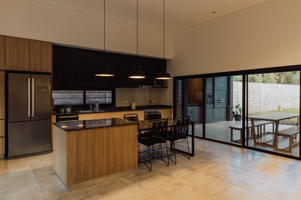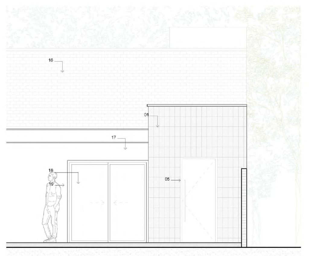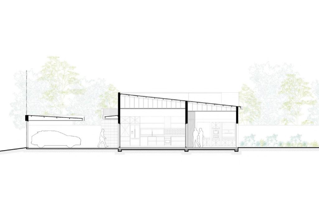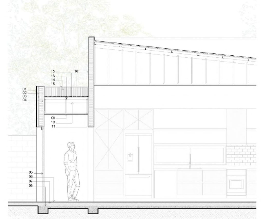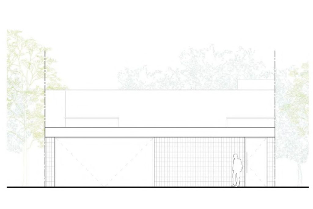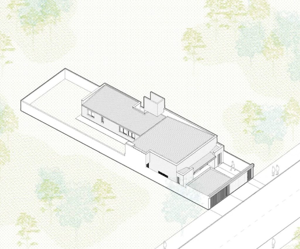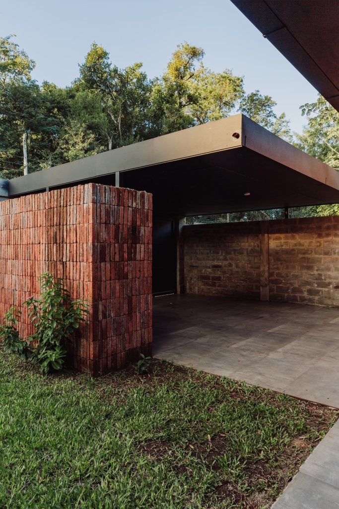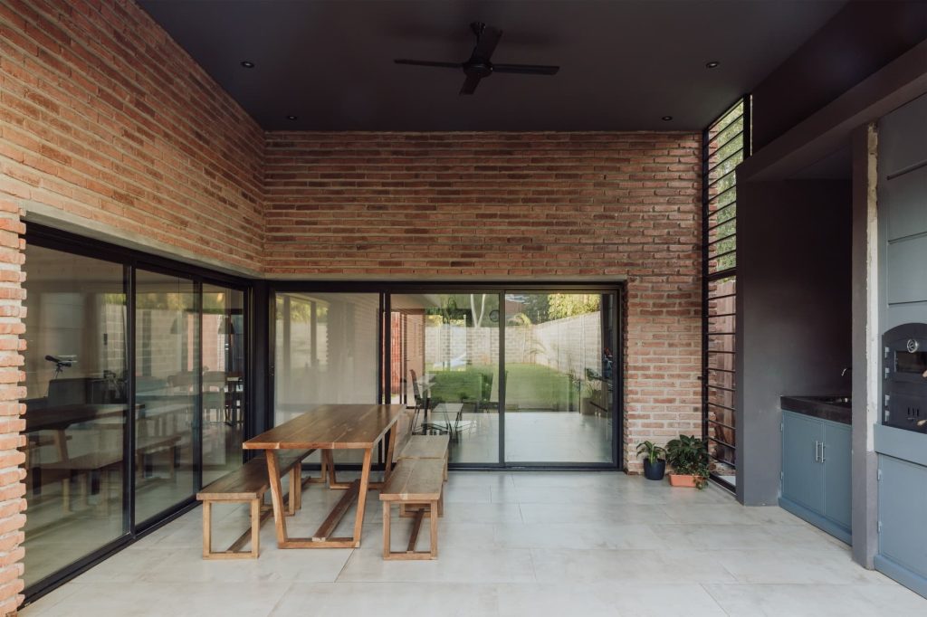 Esta cochera es una galería con un volumen resuelto en ladrillo hacia el oeste que oficiará de baulera o deposito. Hacia el Sur, el paquete social se vincula a una galería/quincho en estrecha relación con la cocina.