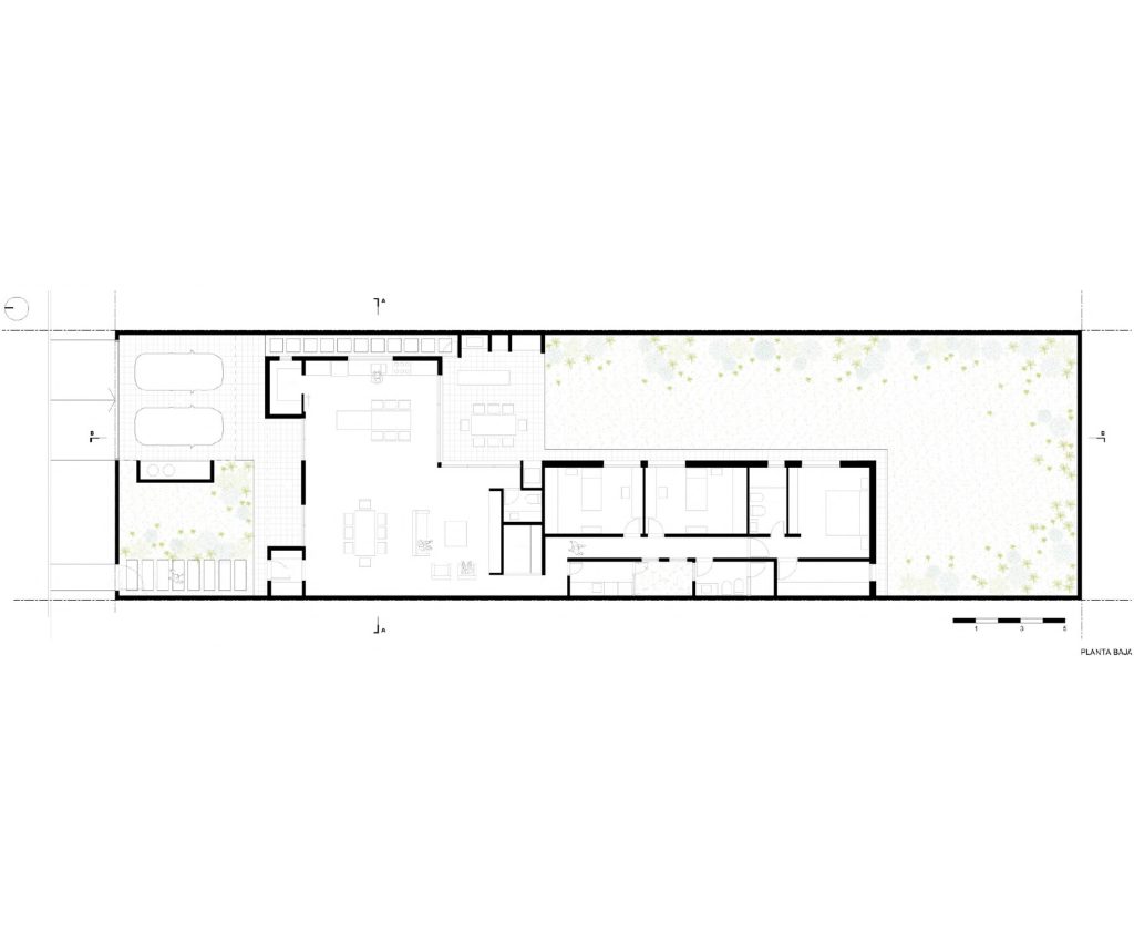 La tipología lineal en forma de L de la vivienda, sumada a la disposición de la cochera genera una diversidad de patios que favorece a la vivienda en cuanto al uso de estos y su diferente caracterización. Por ejemplo, el patio del retiro de frente de adelante es un patio social, vinculado a una galería pequeña que se genera entre el Hall y la Despensa. Después tenemos un patio mayor vinculado al quincho/galería hacia el sur, que adopta un carácter más íntimo, junto al patio de atrás del lote. Por otro lado, tenemos el ultimo patio que cumple un rol fundamental en cuanto a que alberga todos los servicios relacionados al lavadero, a la disposición de equipos exteriores de aires acondicionados, acceso a tanque de reserva y contribuye a la iluminación y ventilación del pasillo que va a los dormitorios junto a uno de los baños y el lavadero.