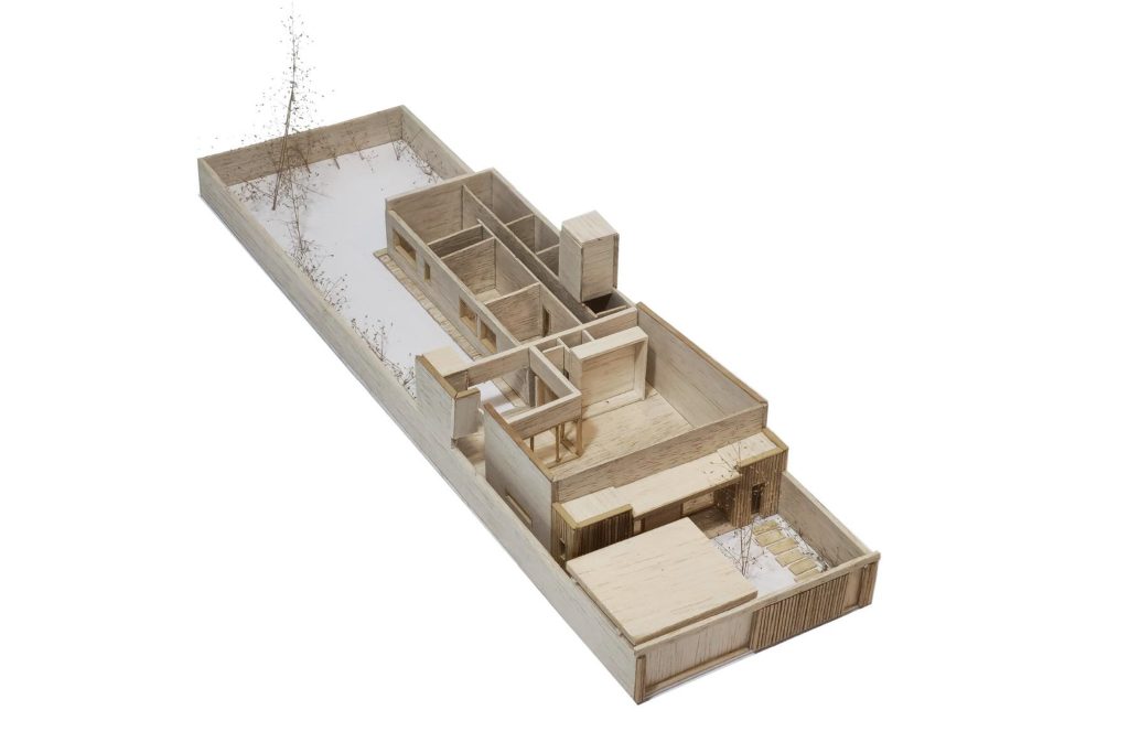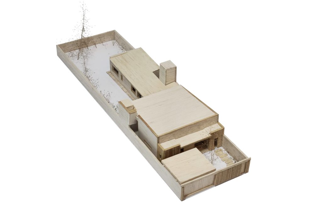 Los espacios cubiertos se dividen en dos grandes paquetes. El primero, y más relacionado a la línea municipal (pero con un retiro de frente) es el que contiene las áreas sociales y la cocina. Se disponen en él un hall de ingreso por el que se accede al Estar-Comedor. Este primer paquete al que denominamos “Social” esta flanqueado hacia el frente de la vivienda (Norte) por la cochera que albergará dos vehículos.