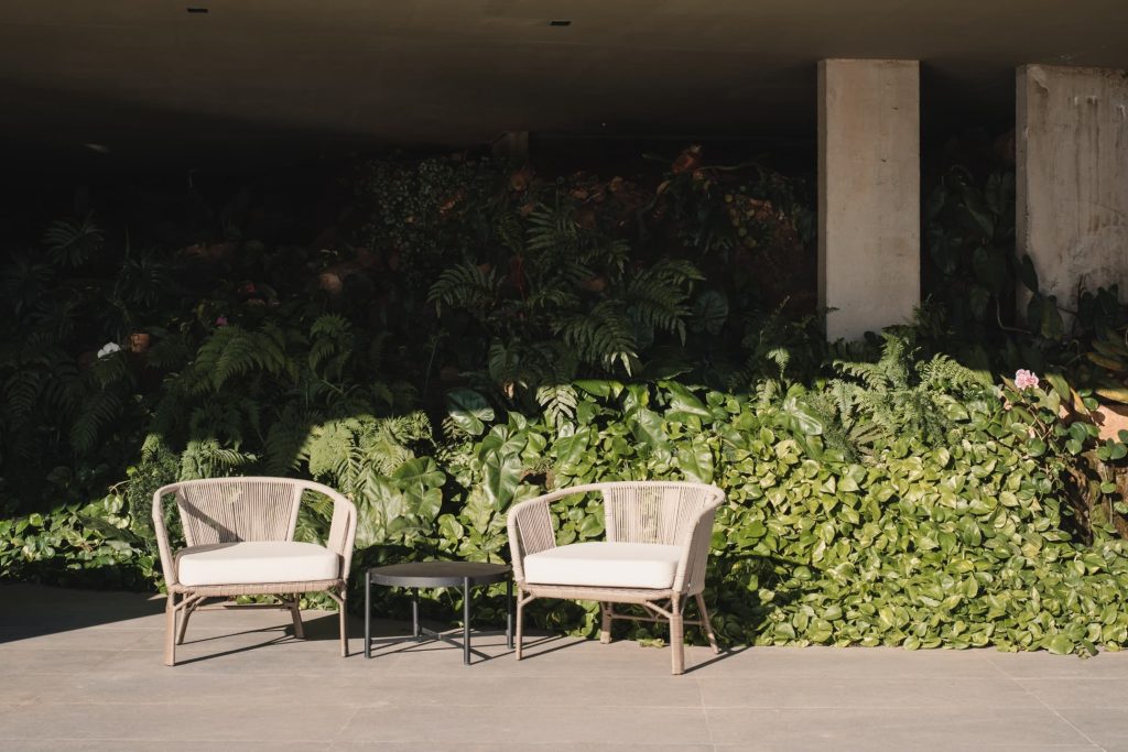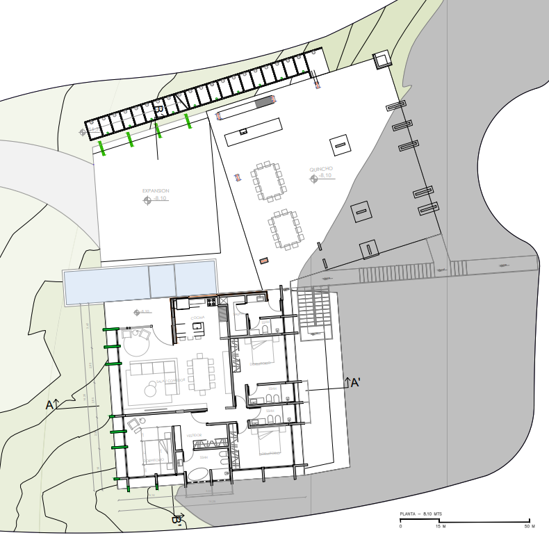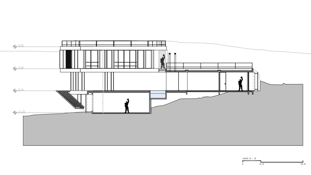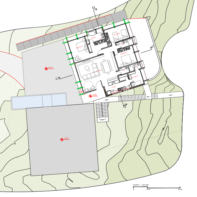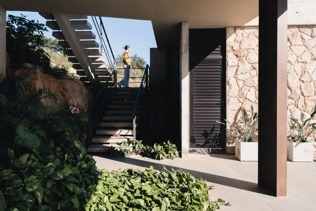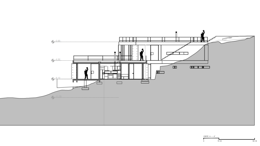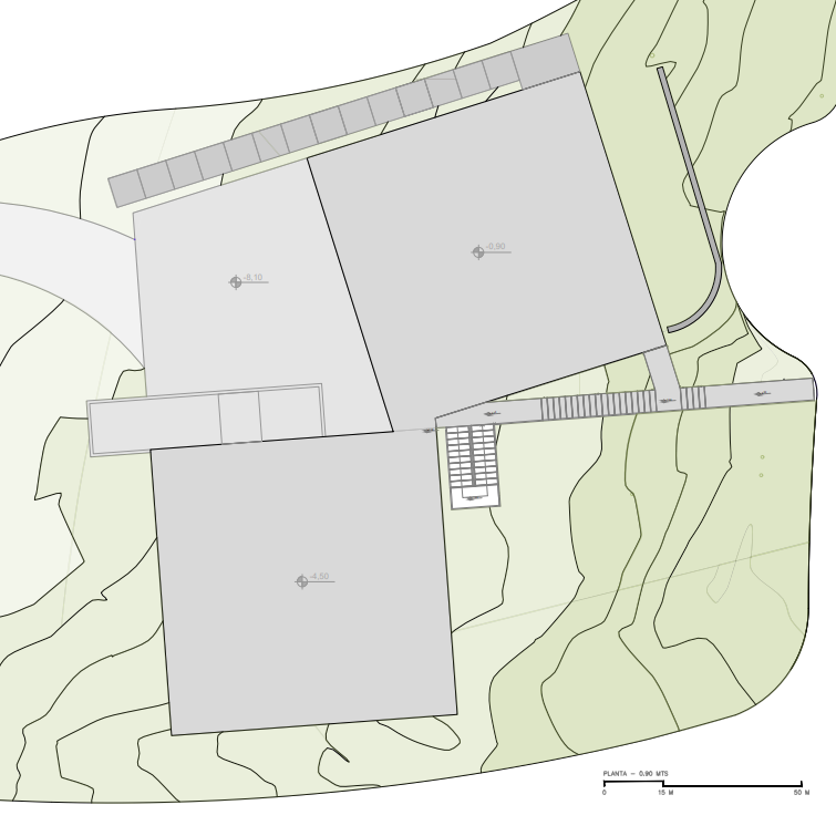 El terreno presenta un desnivel muy pronunciado —15 metros entre el punto más bajo y el más alto—, condición que se convirtió en el punto de partida del diseño. Las viviendas, de planta cuadrada, se implantan en distintas cotas, acompañando la topografía natural. La losa de la casa ubicada en el nivel inferior se transforma en la expansión y terraza jardín de la casa superior, generando una relación directa y orgánica entre ambas.