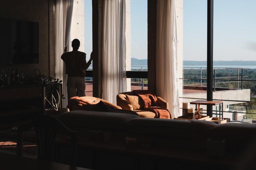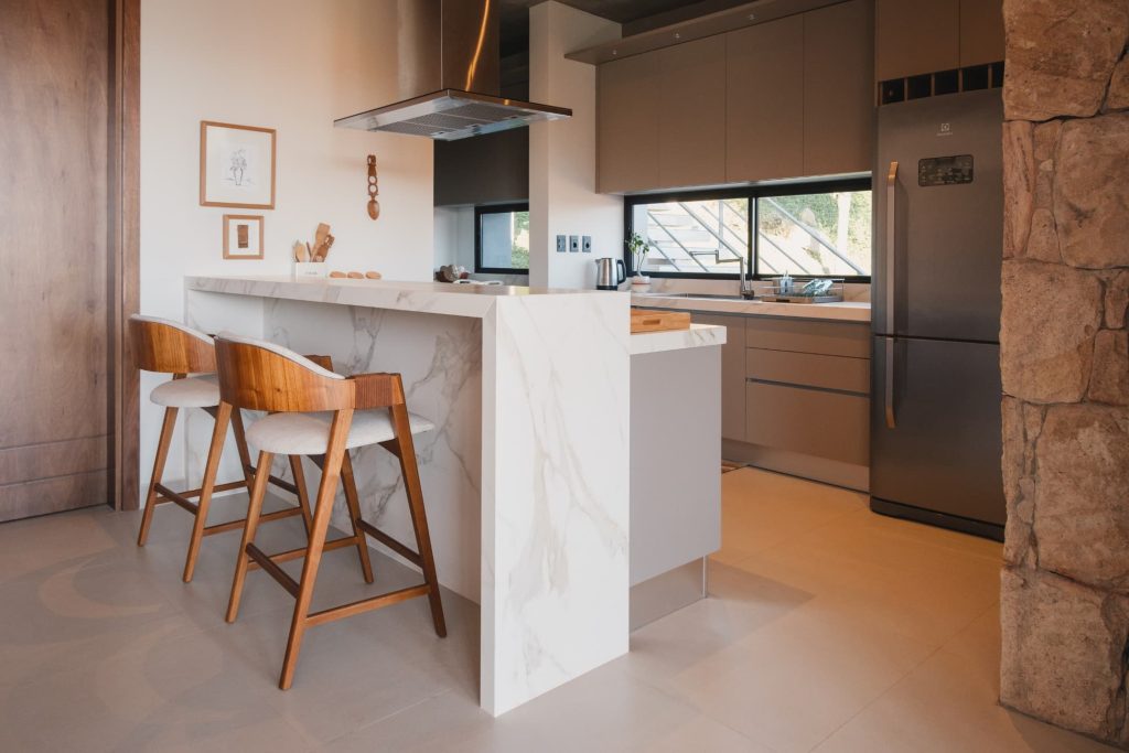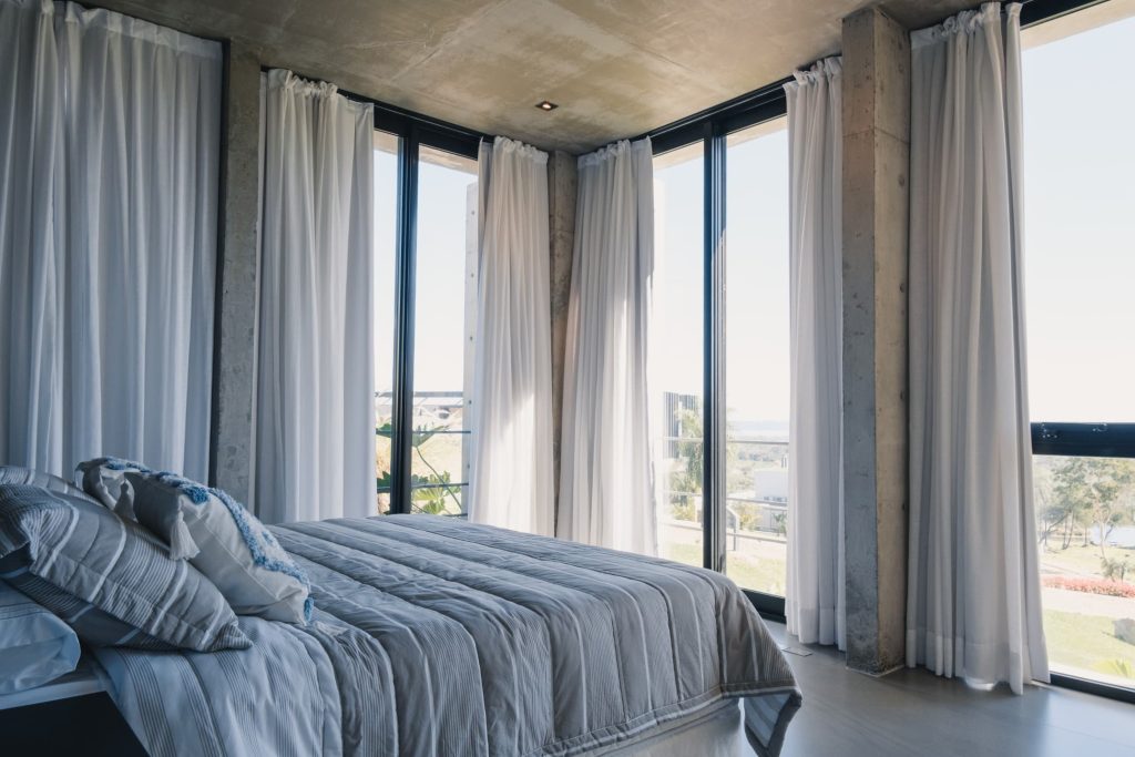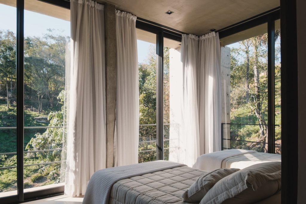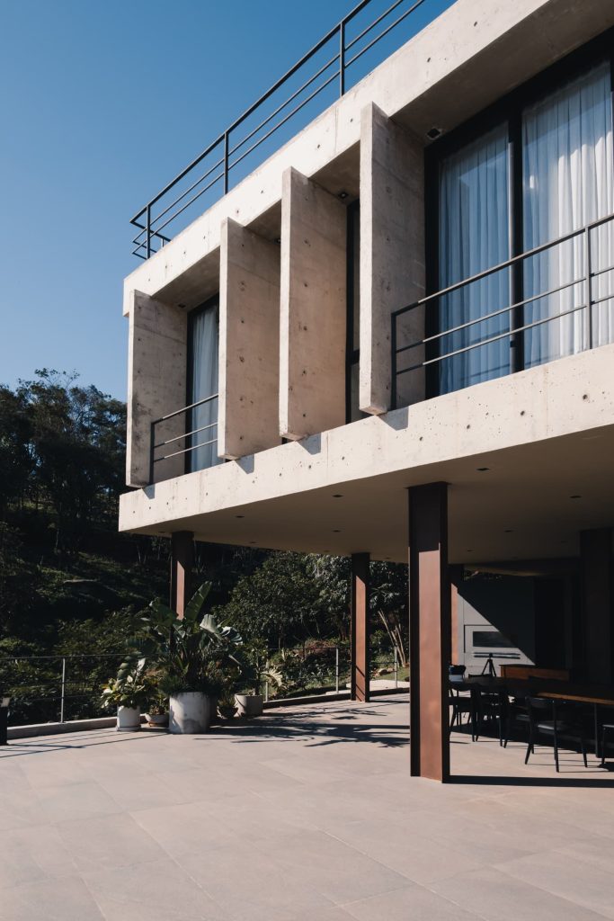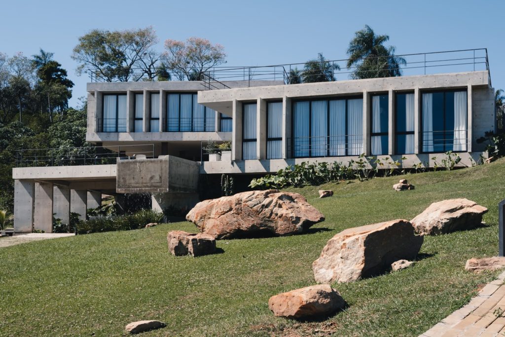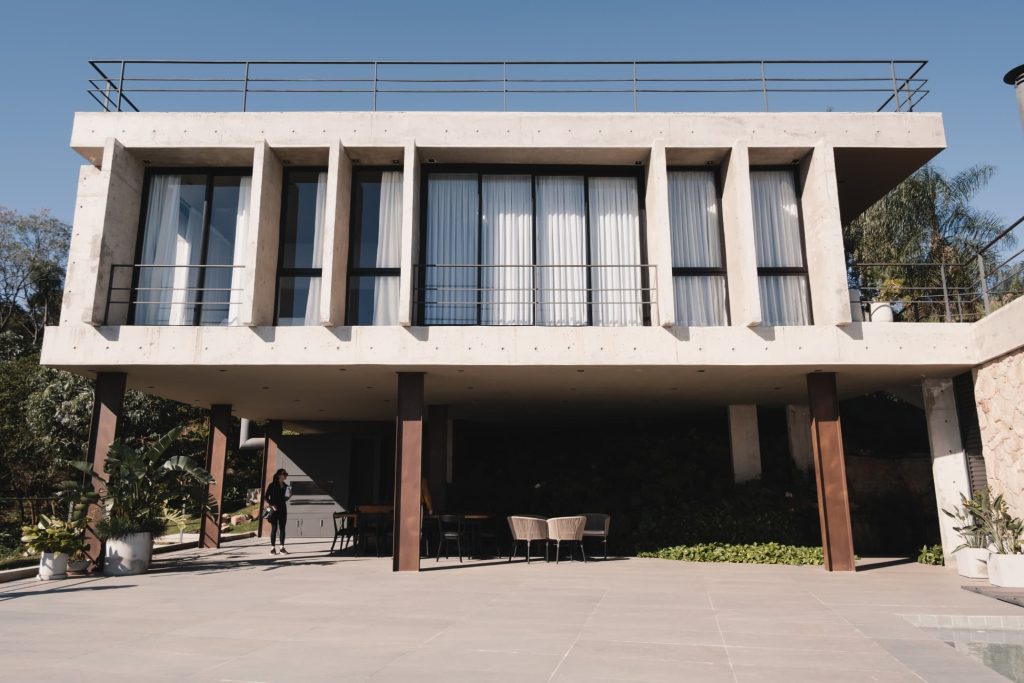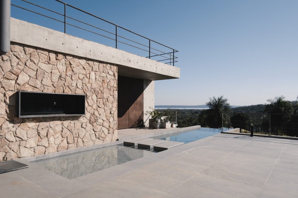 Implantadas sobre roca firme, las casas se resuelven en hormigón visto, incorporando también piedra extraída del propio terreno. Esta materialidad refuerza su vínculo con el lugar. Los principales elementos estructurales son pantallas de hormigón que, además de sostener, funcionan como parasoles, protegiendo las visuales hacia el lago del fuerte sol de la tarde.