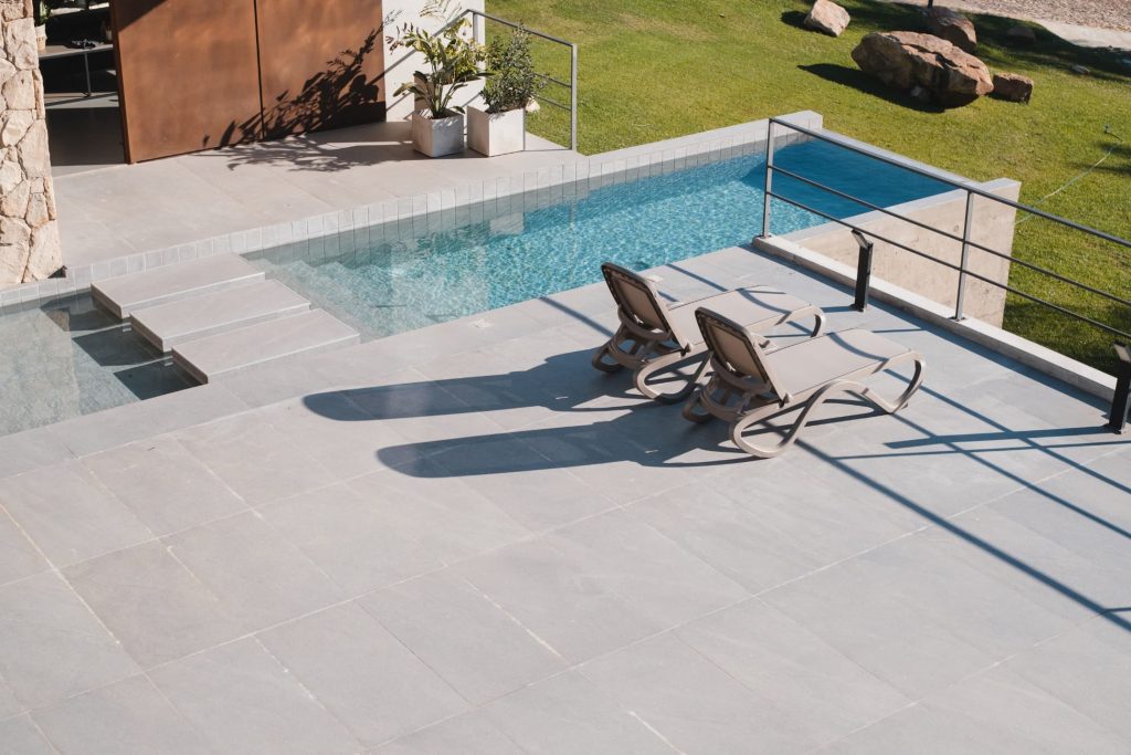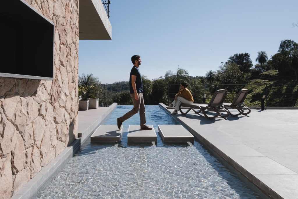 En el nivel de la casa más baja se dispone una amplia terraza compartida, donde se ubican la piscina y el espacio de parrilla, pensados como lugar de encuentro y disfrute.