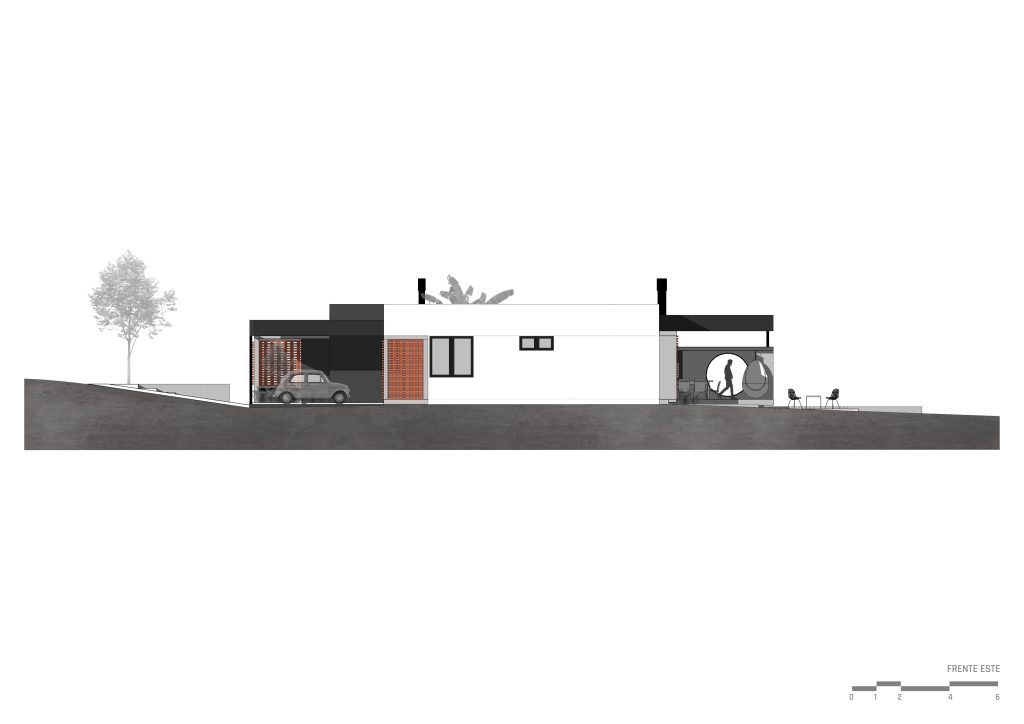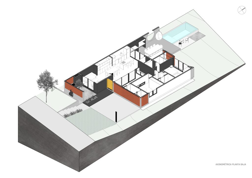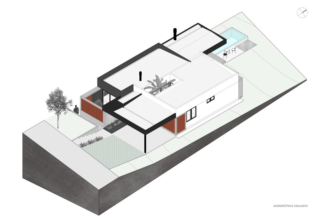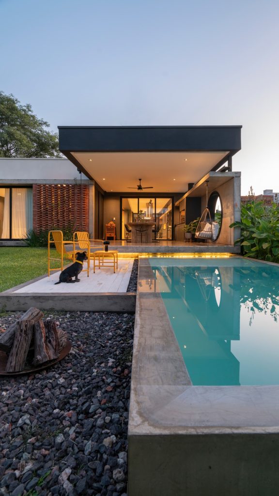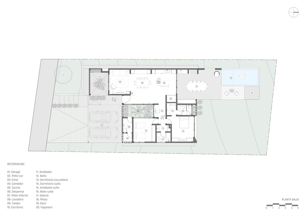 El programa responde a una lógica doméstica simple pero generosa: garage para dos autos, estar, comedor y cocina integrados, galería con asador, despensa, escritorio, un dormitorio secundario con baño completo, y un dormitorio en suite que se abre hacia el jardín y la piscina. Todos estos espacios se organizan en torno a un patio interior, pulmón verde que oxigena y articula la vida de la casa.