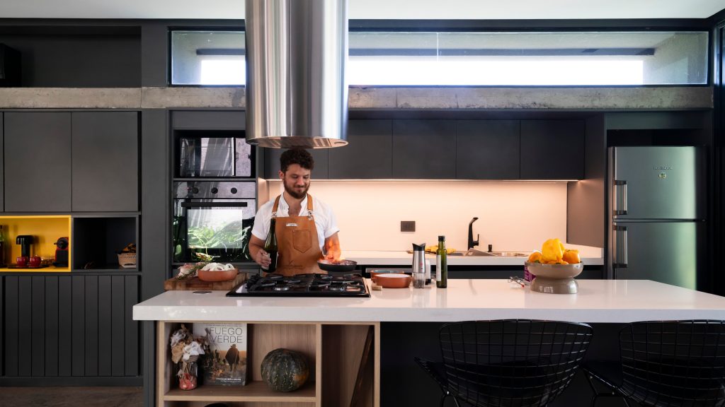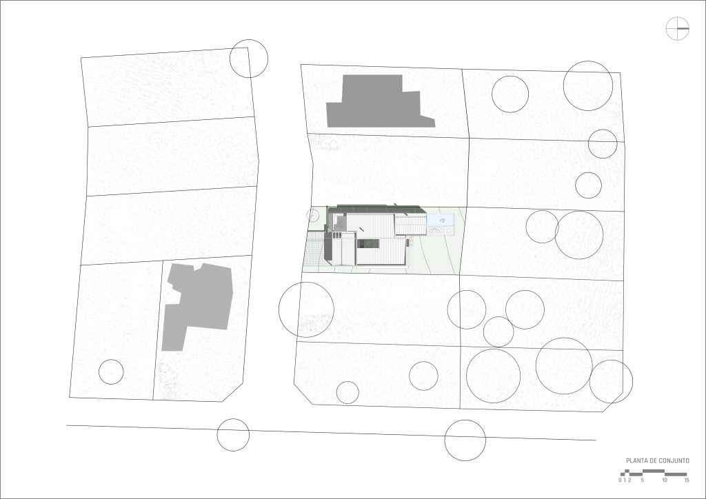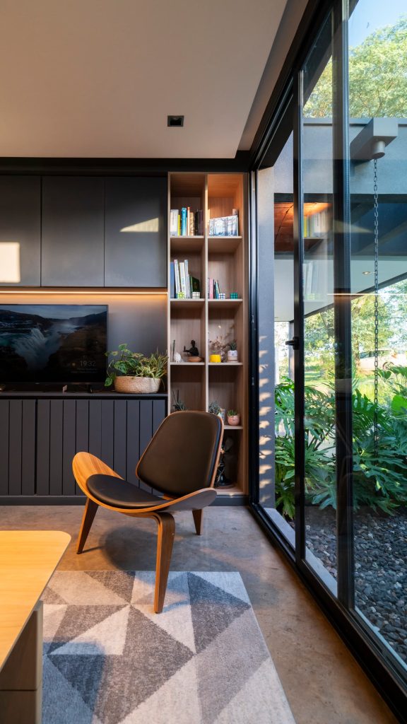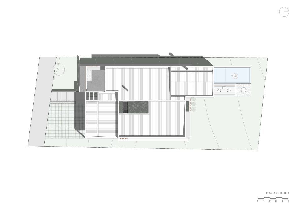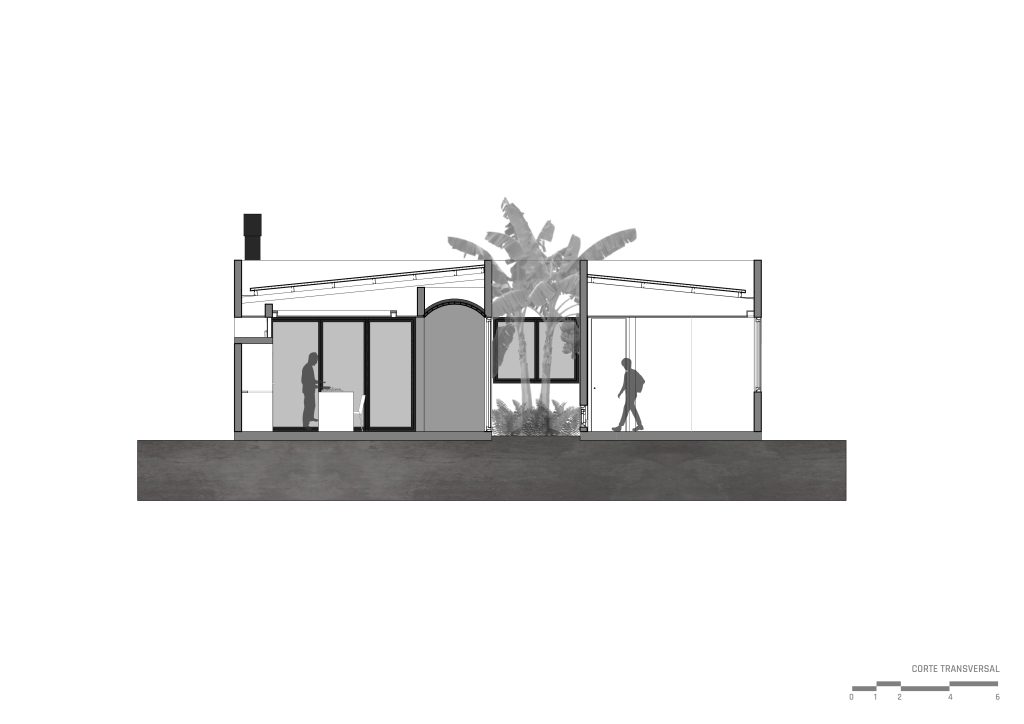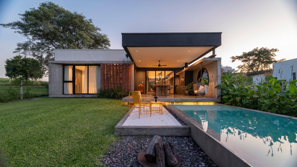 El programa responde a una lógica doméstica simple pero generosa: garage para dos autos, estar, comedor y cocina integrados, galería con asador, despensa, escritorio, un dormitorio secundario con baño completo, y un dormitorio en suite que se abre hacia el jardín y la piscina. Todos estos espacios se organizan en torno a un patio interior, pulmón verde que oxigena y articula la vida de la casa.