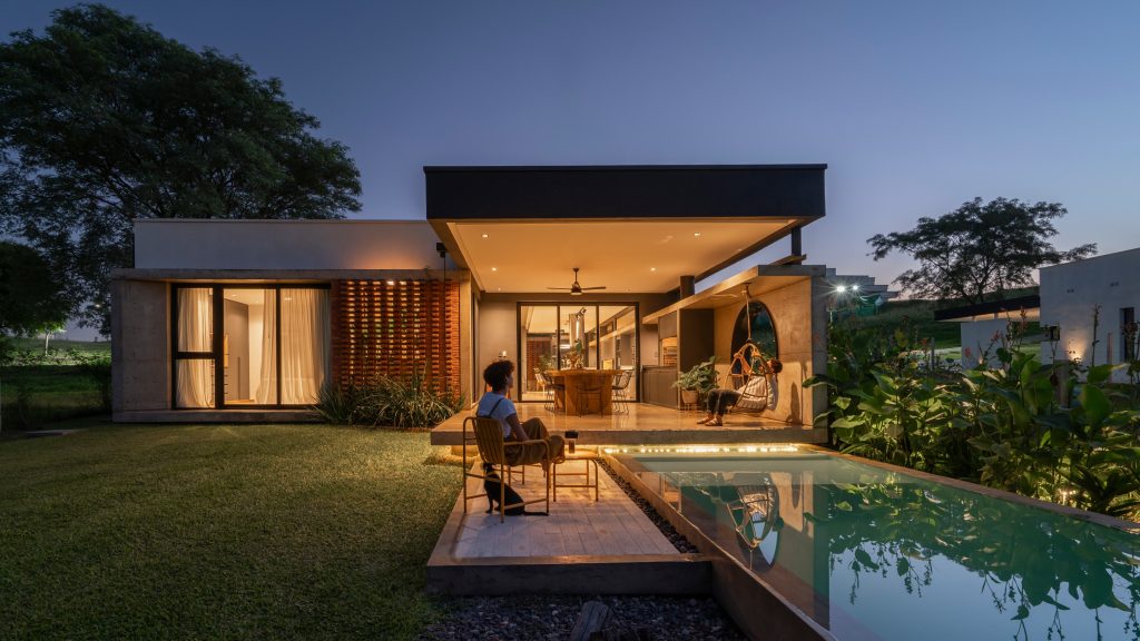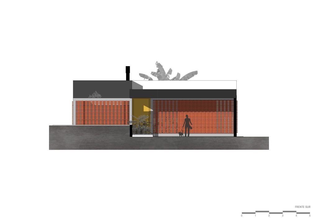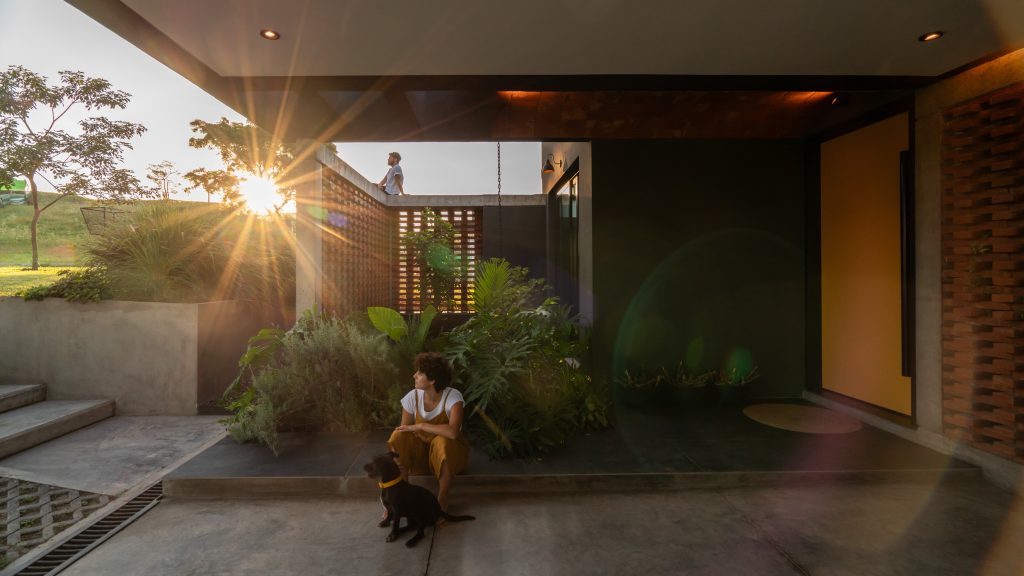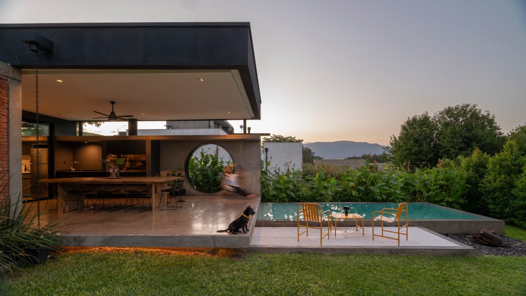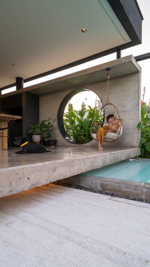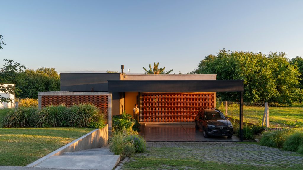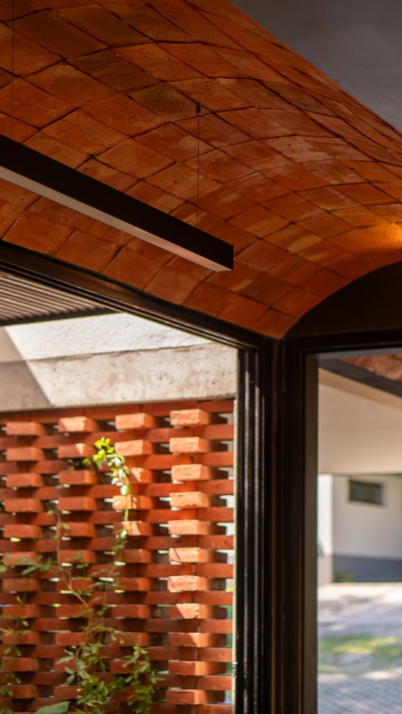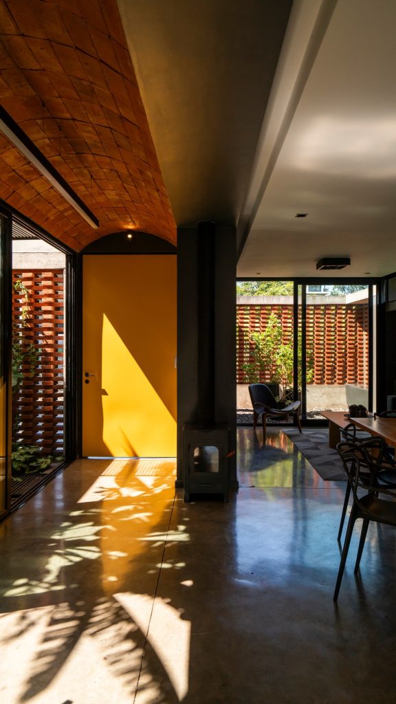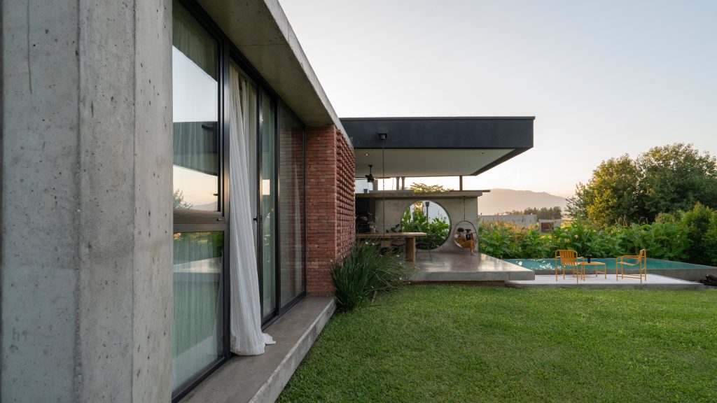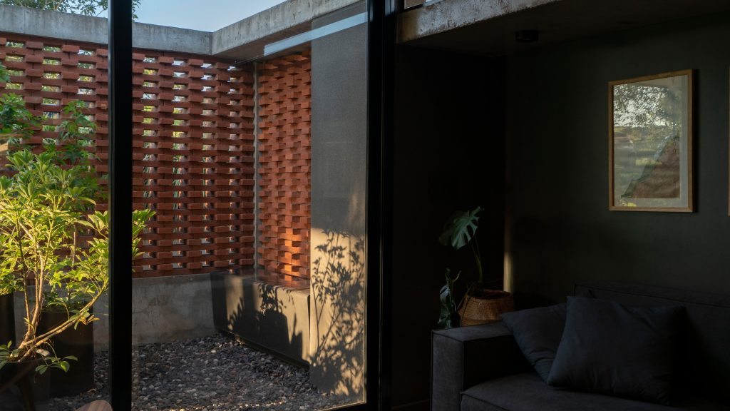La arquitectura se expresa con materiales nobles y en su estado más puro. El hormigón se despliega como una piel continua, envolviendo pisos, muros y cielorrasos, estableciendo una atmósfera sobria y contundente. El ladrillo, en cambio, introduce textura, calidez y movimiento. Utilizado en múltiples configuraciones —macizo, celosía, bóveda— genera tramas que filtran la luz, crean privacidad y marcan una temporalidad visual que cambia a lo largo del día.