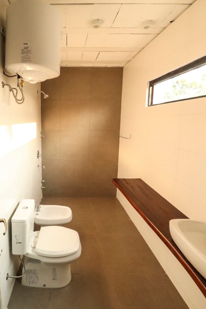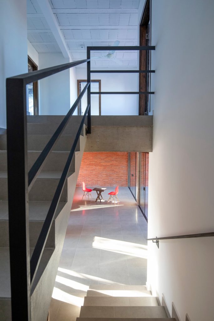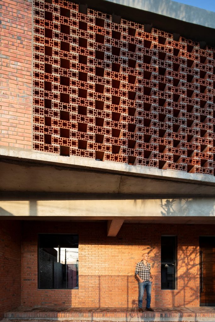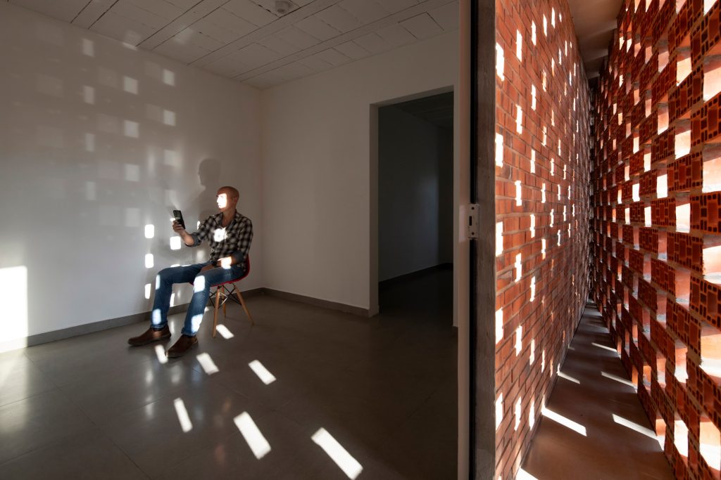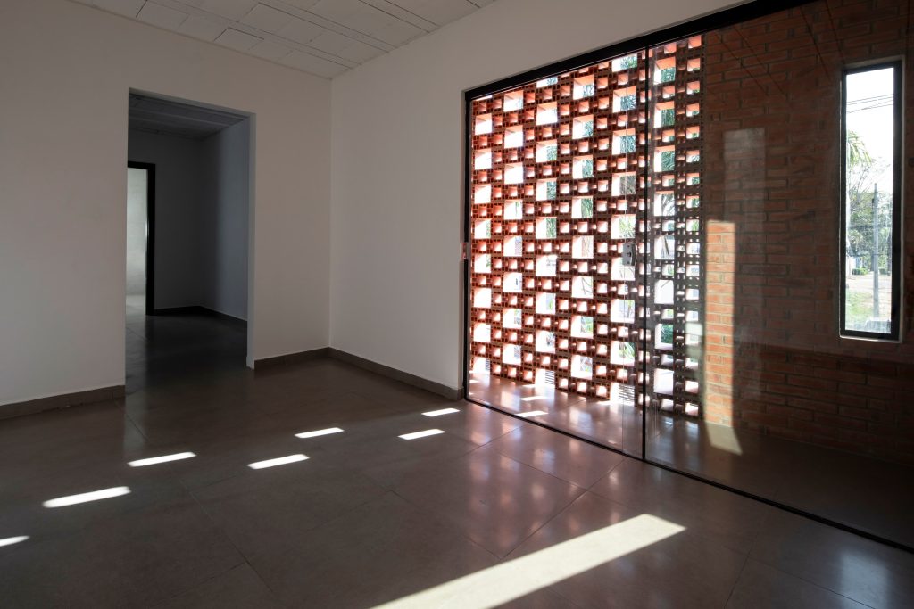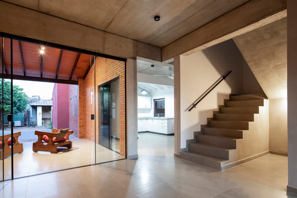 El voladizo del segundo nivel proyecta un semitecho que protege el acceso de las lluvias intensas y del sol del verano. Se utilizaron materiales locales: ladrillo semiprensado, hormigón a la vista, aberturas estándar, puertas de tirantería reciclada reutilizadas como mobiliario, iluminación LED y cubierta de bovedillas cerámicas. La galería posterior extiende el espacio social interior hacia el fondo del terreno, reutilizando el antiguo techo de tejas, y se convierte en un área intermedia de transición entre interior y exterior.