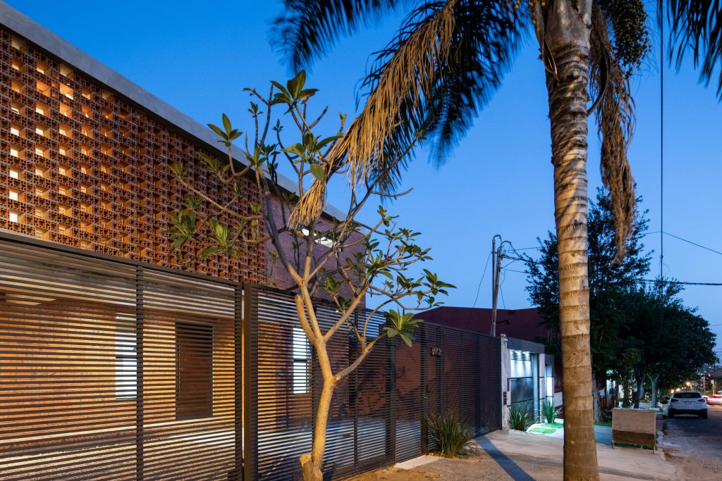 El principal desafío fue la orientación oeste, que expone la fachada al sol de la tarde. La respuesta fue concebir una envolvente de doble piel que actúa como barrera térmica. En planta baja, se duplicó el muro generando una cámara de aire ventilada; en planta alta, para mantener la relación visual con el entorno, se diseñó un balcón perforado con un parasol de ladrillos huecos, que tamiza la luz sin perder apertura hacia el barrio.