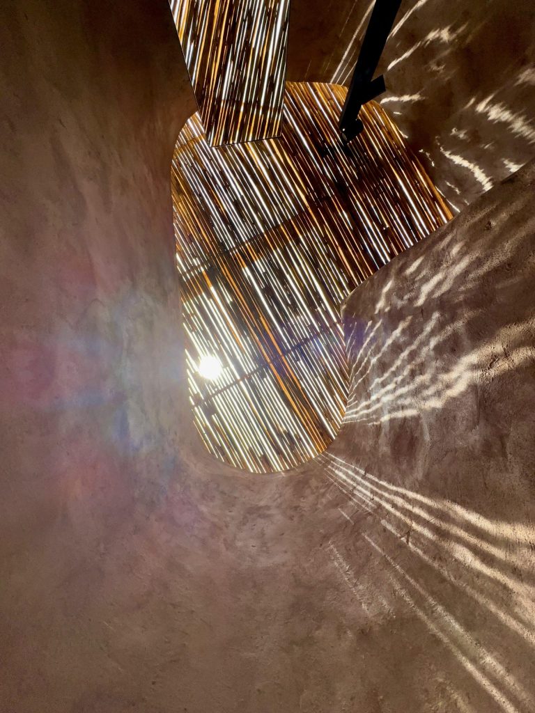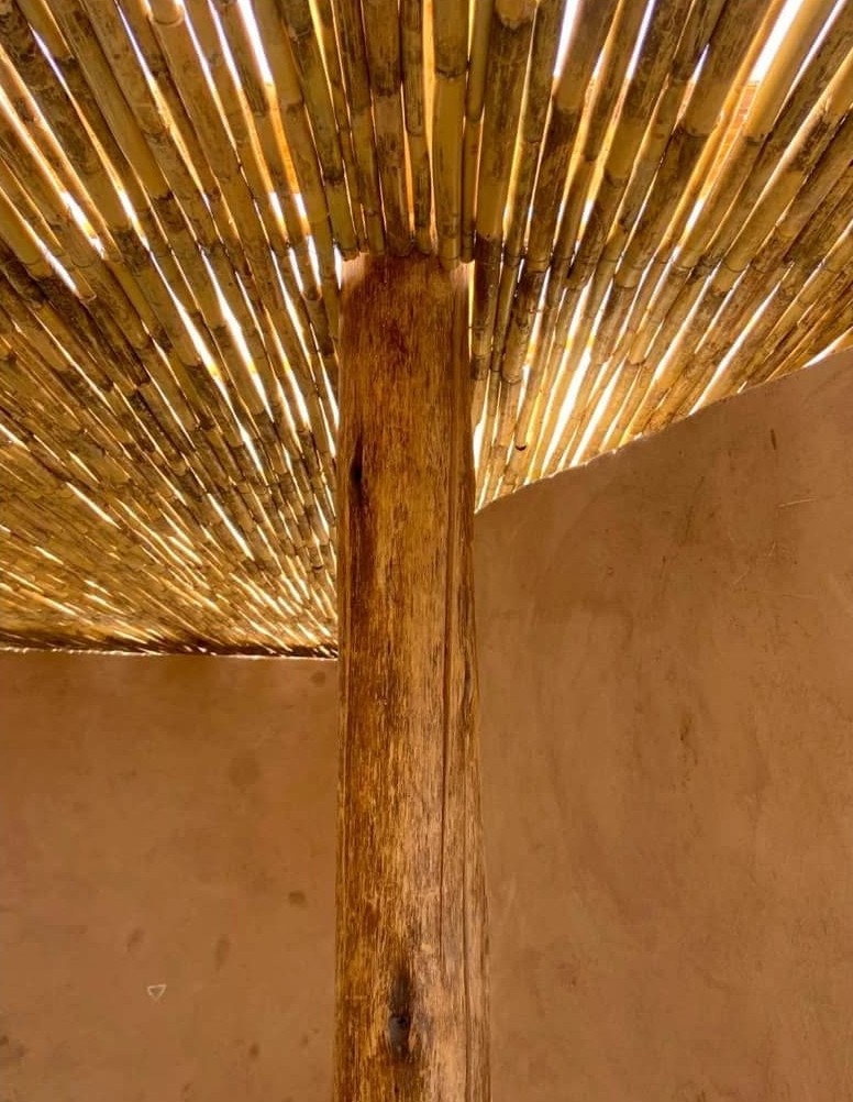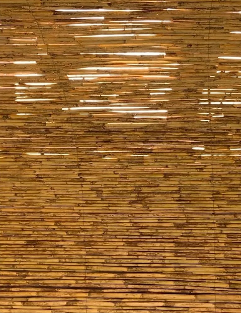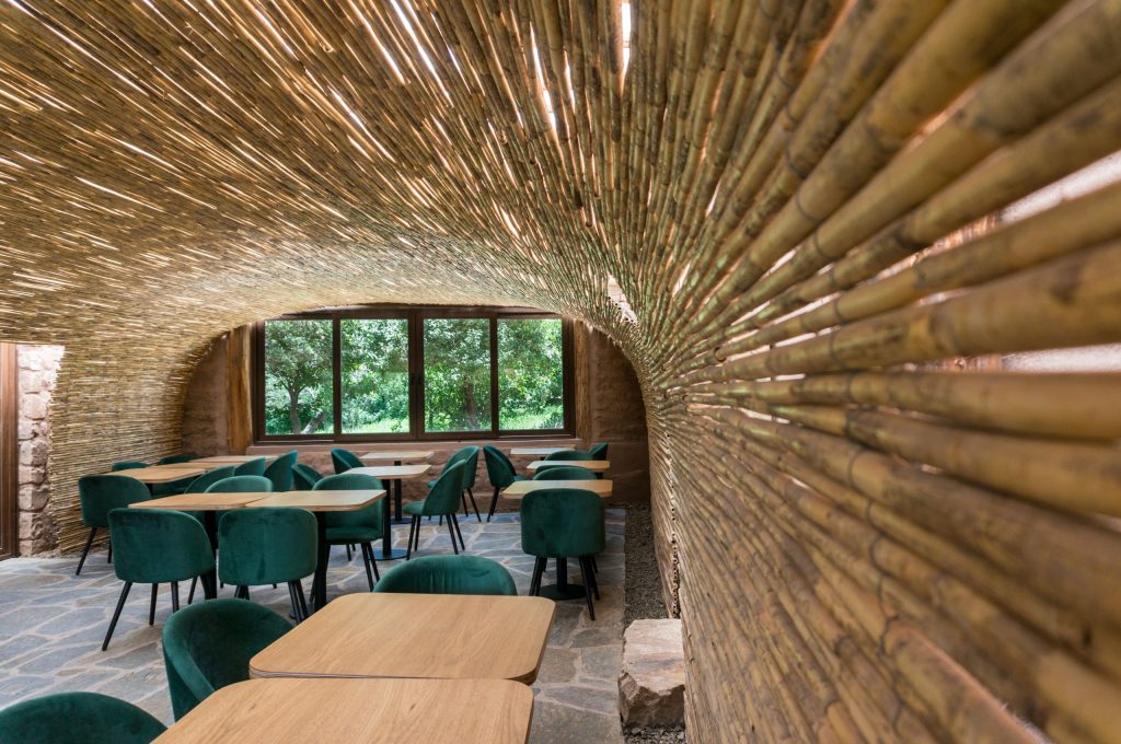 El espacio interior se caracteriza por una bóveda de cañas, cuya disposición está sujeta a una estructura metálica de hierro que garantiza estabilidad y resistencia a la carga. La utilización de cañas como material de techado responde tanto a consideraciones estéticas como funcionales, permitiendo la creación de un ambiente cálido y envolvente. El piso del restaurante se resuelve con laja de piedra natural, complementado con un borde de piedra pizarra triturada, lo que proporciona durabilidad, resistencia y un acabado rústico adecuado al diseño global del establecimiento.