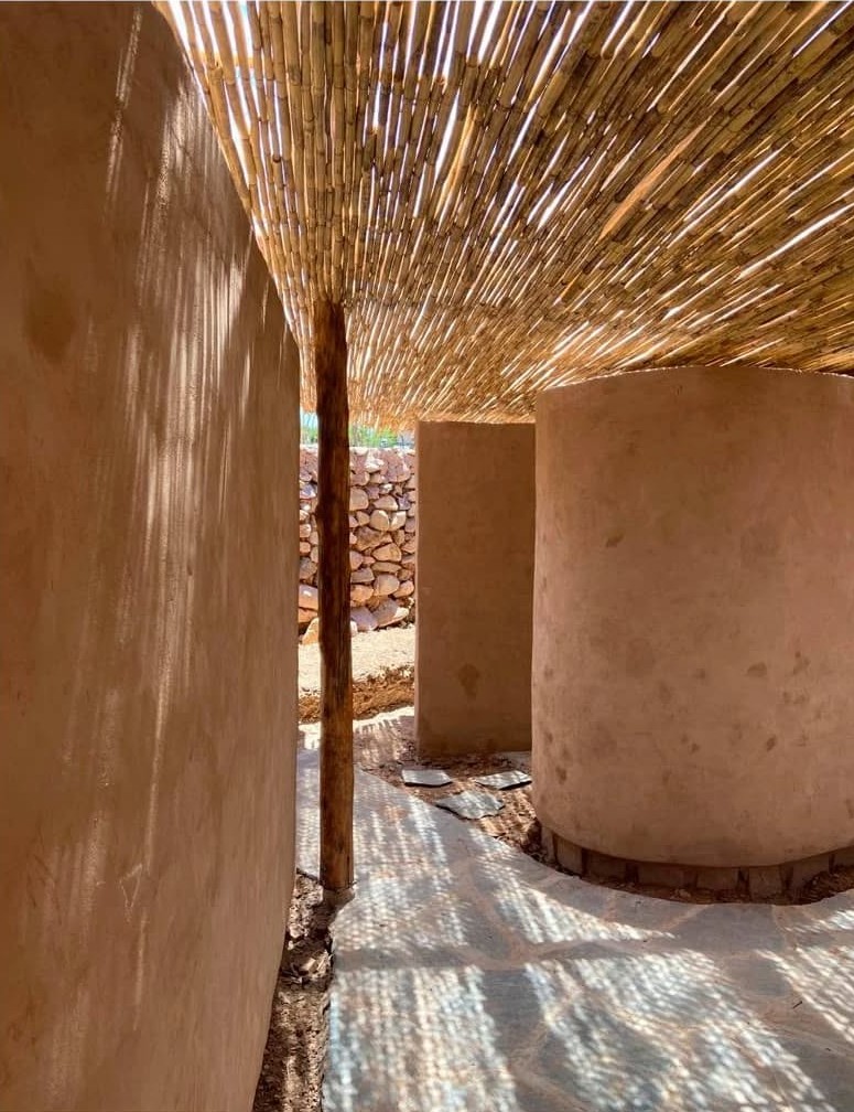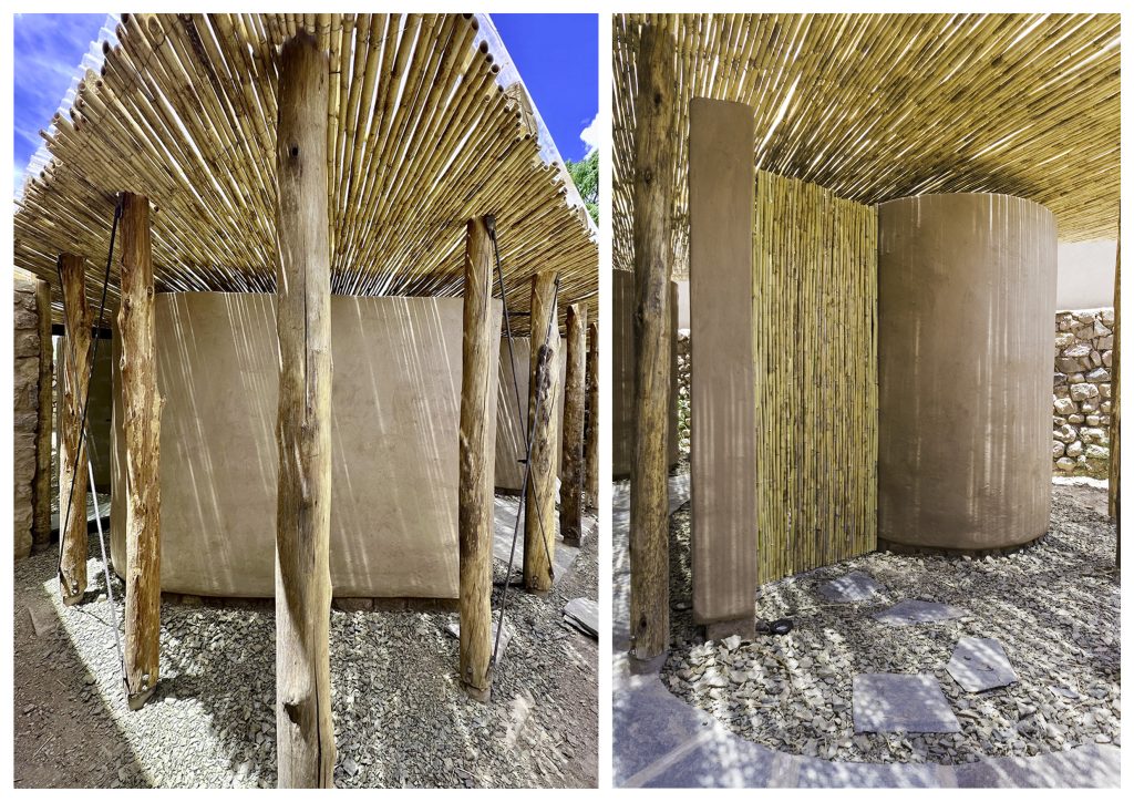 Los baños del establecimiento se encuentran bajo un techo de chapas transparentes, lo que facilita la entrada de luz natural y contribuye al confort visual del espacio. Las paredes de los baños son de adobe revocado, material que, combinado con un revestimiento de barro impermeabilizado con laca, asegura la protección y resistencia frente a la humedad. El piso, similar al del área principal, está formado por laja, con un borde de piedra pizarra triturada, que refuerza la continuidad estética y funcional de los acabados en todo el restaurante.