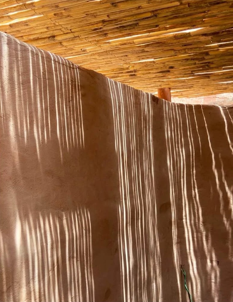 La edificación está compuesta por una envolvente de ladrillo de adobe, ofreciendo un adecuado confort térmico y una adaptación al clima local. El coronamiento superior de la estructura está constituido por tabiques de quincha, una técnica constructiva que refleja la autenticidad del paisaje local. La estructura principal se organiza a partir de un armazón independiente de troncos de madera que soporta una cubierta de chapas traslúcidas, permitiendo un aprovechamiento eficiente de la luz natural y contribuyendo a la ventilación cruzada del espacio interior.