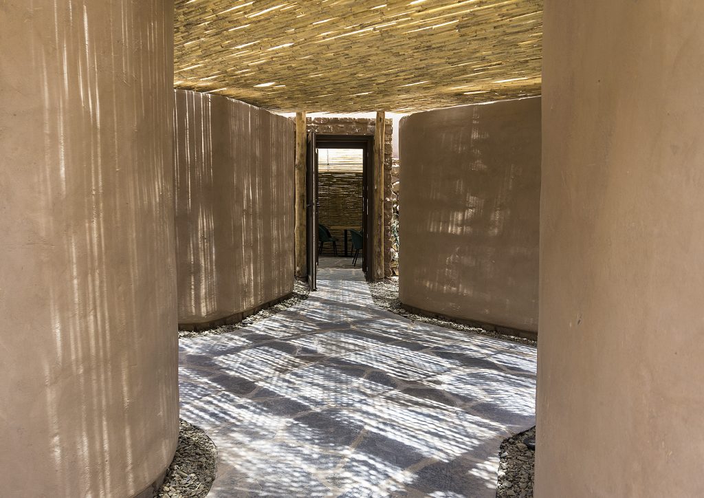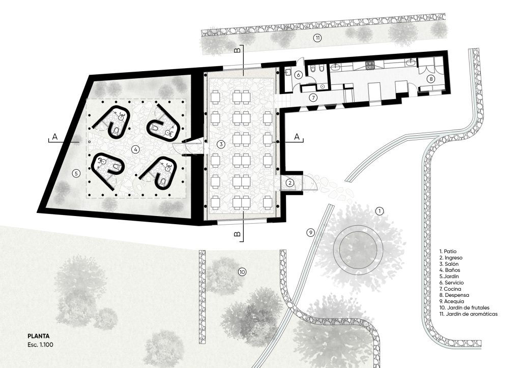 El acceso principal y los servicios sanitarios están definidos por una antecámara de mampostería de piedra que funciona como espacio de transición, tanto funcional como estéticamente. El cielorraso de madera actúa como encofrado perdido para la losa de cubierta, ofreciendo un acabado de tipo artesanal, a la vez que contribuye a la estabilidad estructural del espacio.
